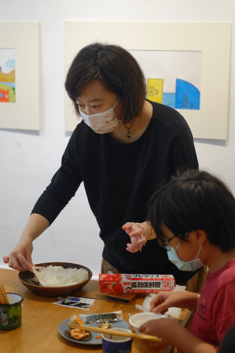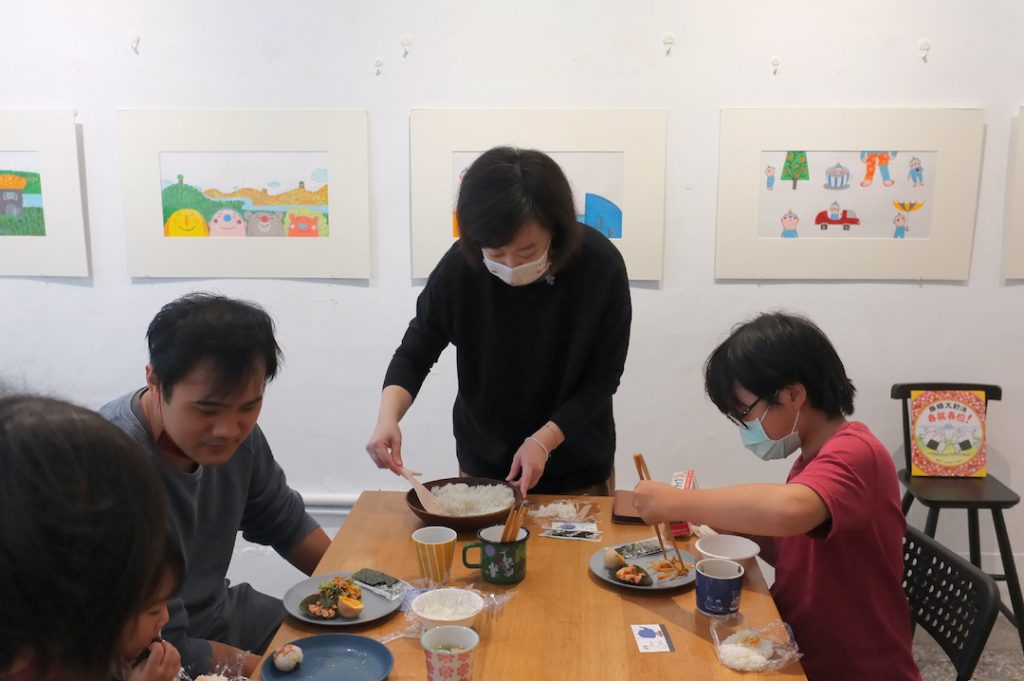 饑腸轆轆的小朋友們對於如何搭配和如何享用飯糰都有自己獨到的見解,有的堅持要捏好飯糰的形狀,有的主張飯糰要料多飽滿,有的實在等不及邊捏邊吃轉眼清空餐盤,闆娘很喜歡舉辦這樣大人和小孩都能自由歡樂的飯糰派對,在餐桌上和各種材料遊戲創作,一起分享彼此讓飯糰變得好吃的方式,不需要太多的限制和規則,一桌和樂融融吃得飽飽也玩得開心,正好呼應了書裡飯糰們滾啊滾、一起滾滾滾的融洽生活了!