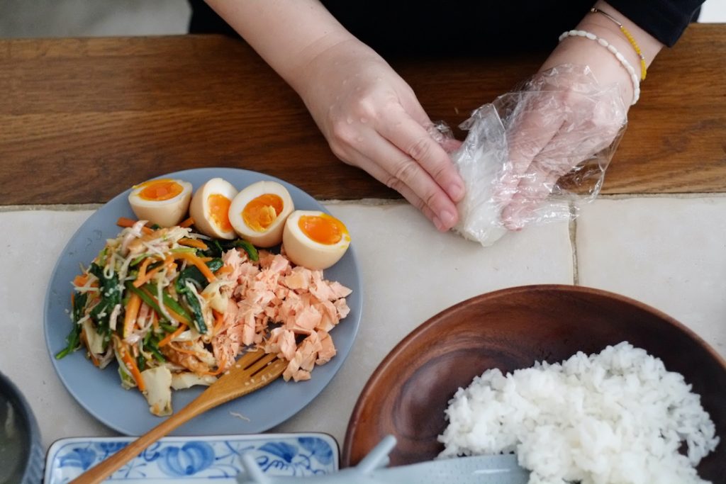 我們先示範了三角形、圓形和橢圓形的飯糰捏製手式,溫熱的米飯拌上芝麻油,如果是爸爸媽媽來捏,可以沾鹽水直接上手,小朋友隔著保鮮膜捏製比較安全衛生,也較容易控制米飯形狀,可以自由選擇飯糰裡要放入什麼樣的餡料,對切的糖心蛋包入飯糰裡捏成球狀,大口咬下可以嚐到Q嫩的蛋白和香濃的蛋黃,豐富多重的口感又能輕鬆入口,鮭魚煎香後手剝成細片可以拌入米飯中再捏製成飯糰,也可以包在飯糰正中央作為餡料,鮭魚油香捏成飯糰後刷上醬油再微煎或烤,是大人也會喜歡的飯糰風味,什錦蔬菜同樣可以拌入飯裡捏製成飯糰,也可以搭配其他口味的飯糰作為清口菜。