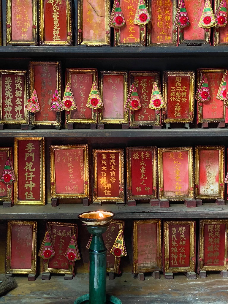 這些「奶媽」塑像非常真切,她們跟身邊的小屁孩,演繹著照護孩子的「日常」:「攬腰教企夫人」「臨盆保產夫人」「淋瀨花枝夫人」「白花送子夫人」「東園大笑姑婆」「西園小笑姑婆」「含茶嚼飯夫人」⋯⋯在蓮溪廟的側殿的其中一進——金花夫人殿,世人在此,有著對孩子的各種盼望與祈禱。廟宇建築正中央,是「花仔」「花女」供奉殿,百年來早夭的小孩,靈魂安居在此。這些小孩沒有名字,他們被喚作:「冥兒」「先(仙)娘」「花仔」「花女」「大姐銀」,為方便後人敬奉,這些孩子也被喚作「太公」「大伯娘」「大伯爺」⋯⋯也有父母無法離愛,在牌上喚他「愛兒」。若有了愛,時間就好像一直停留了,名字也是不能有的,有了命名,親與子相欠,愛會在,緣就難離。無論如何,廟方會點一盞燈,許多牌位什麼都沒寫,他們是「沒被生下來的孩子」,只有「敬如在」三個字。