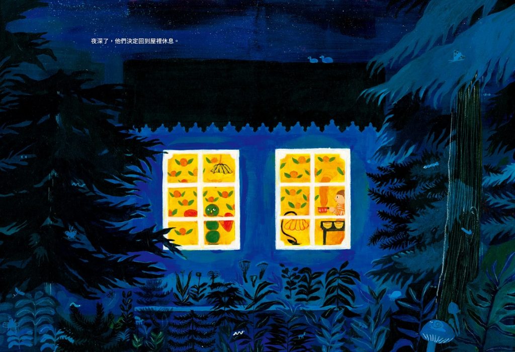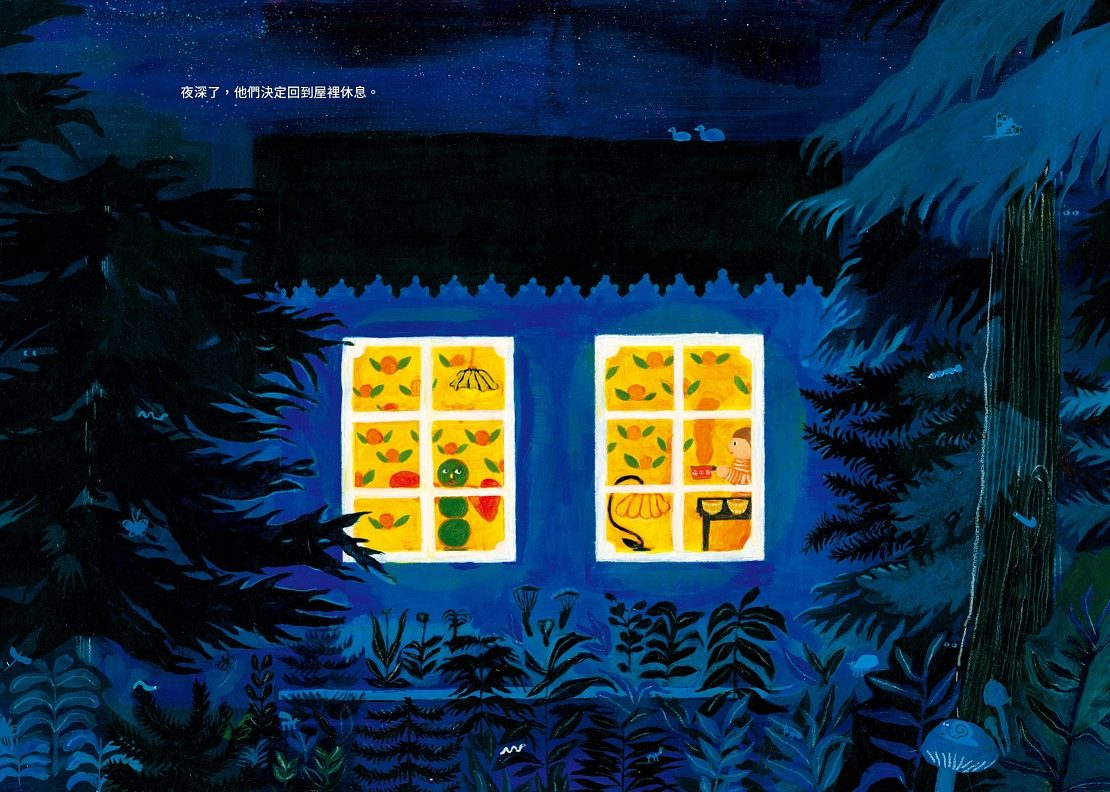 我喜歡《雪橇屋》裡,隨著情節,運用誇大的圖像及渲染般的整片色彩展現了各種關於「家」的層次。從最初的,家就一直守在原地,巨大的果實、色彩斑斕且鮮豔豐富,象徵著衣食無虞;隨著身體的長大,是需要方法讓家陪伴著成員看見不同的風景,家依然能遮風避雨,是漆黑夜裡的一盞鵝黃色的光;隨著眼界的開拓,是需要結合更多的資源拖曳著它前進,暖色的森林為底,烘托出大片的雪白山景,相較之下,畫面裡頭的人們比例雖然小,色調卻充滿著溫暖又彷彿能夠無限填充的可能。