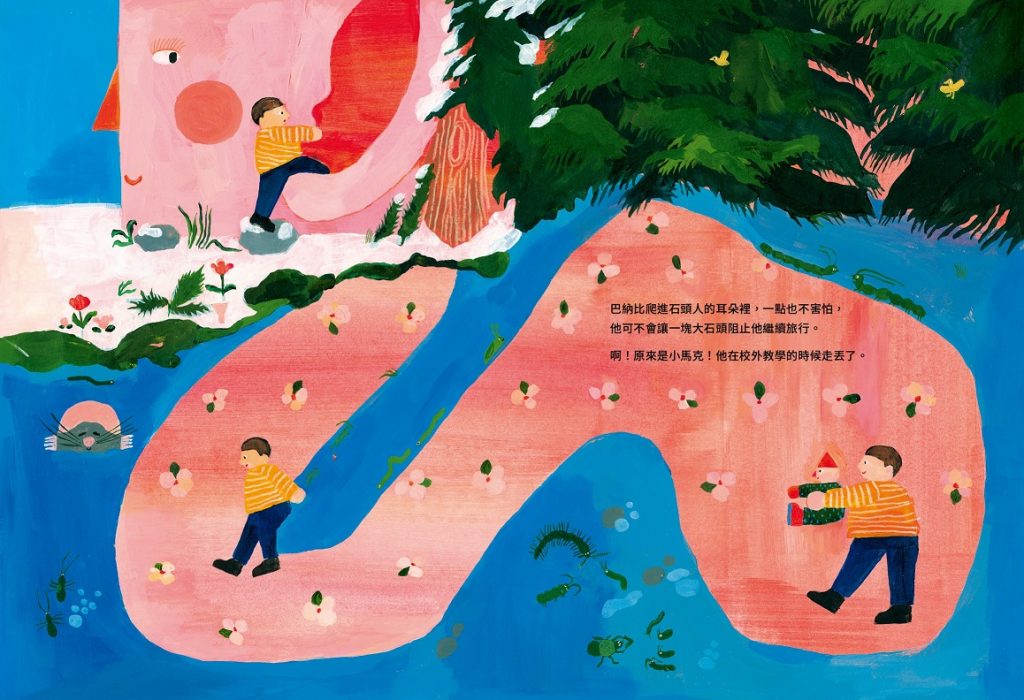 我更喜歡的是,巴納比並非全然地被故事情節給帶著走,我們可以發現,他的人物性格才是讓整個故事情節往下走的關鍵,猶如故事的一開始,他的耐性讓這趟旅程在剛剛好的時機啟動了;當登山客們好奇地來敲門,他的敞開大門,讓登山客們成為後續旅途中的一股助力;聽聞石頭人的煩惱後,他不加思索地鑽進石頭人的耳朵裡,拯救了迷途的小馬克,拯救了石頭人的難受,也排除了石頭人的障礙,更是拯救了自己的旅程一把。