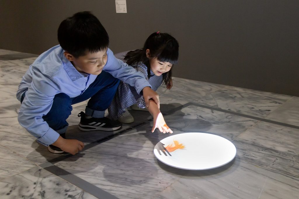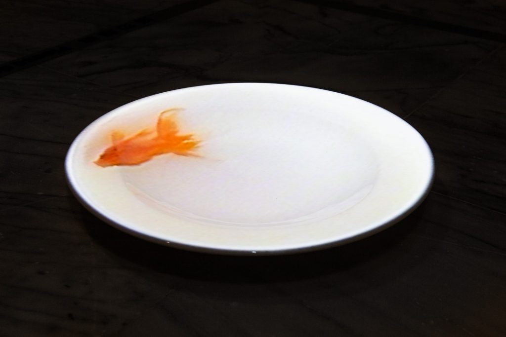 新媒體藝術家袁廣鳴《盤中魚》將一隻紅色的金魚投影在白色瓷盤上;儘管優雅地自由游動,卻始終游不出瓷盤的邊界,充分展現出影像與實物之間虛實交錯的概念。