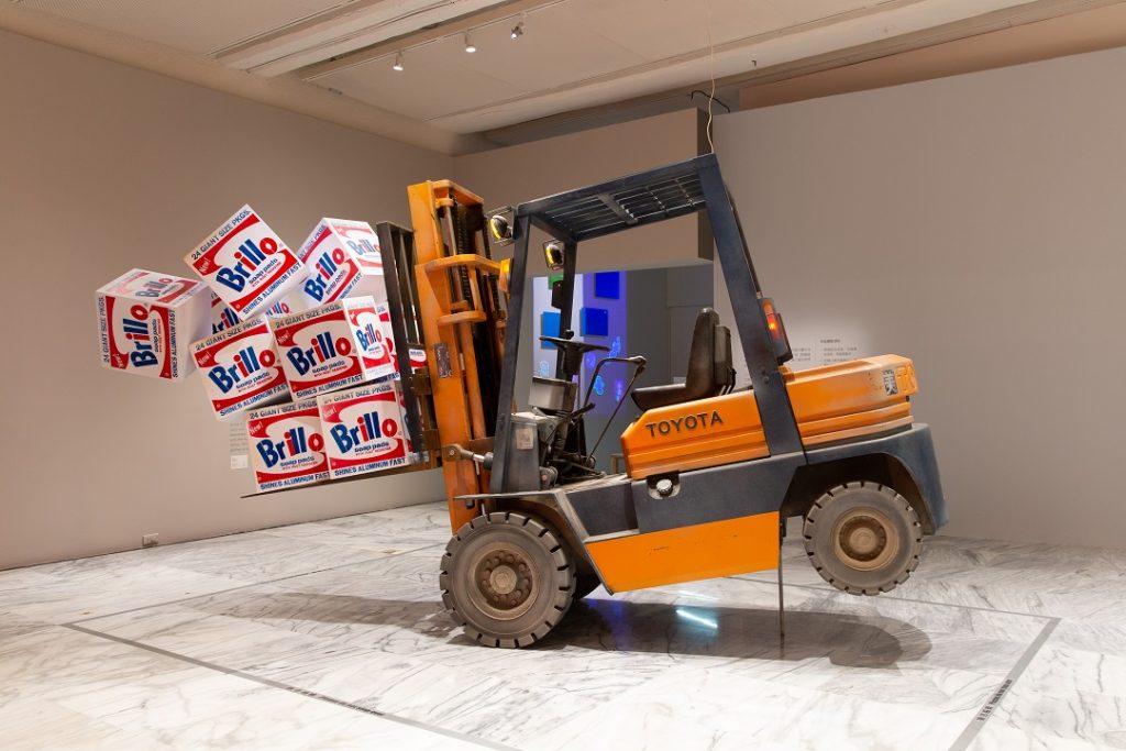 本次教育計畫也邀請數件委託創作的空間裝置作品,包含廖建忠以1:1、幾近複製的手法所完成的《堆高機2.0》。藝術家在貨叉上堆疊數個紙箱,營造堆高機突然剎車而失衡的景象,但實質上卻又紋風不動,虛有其表的沉重外觀與可拆解、可搬動的本體產生荒謬的對比。