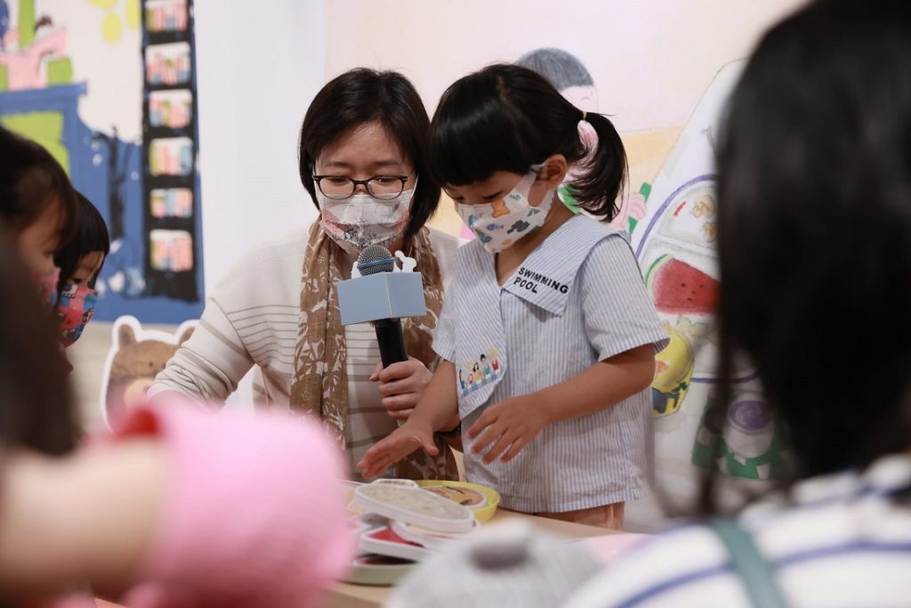 開展的第一天,寶寶們主動牽著爸比媽咪到「寶寶動動手」操作區,拿著磁鐵食材和餐盤選著要吃什麼呢?而信誼基金會廖瑞文營運長在旁給予很多貼近寶寶生活經驗的閱讀引導。