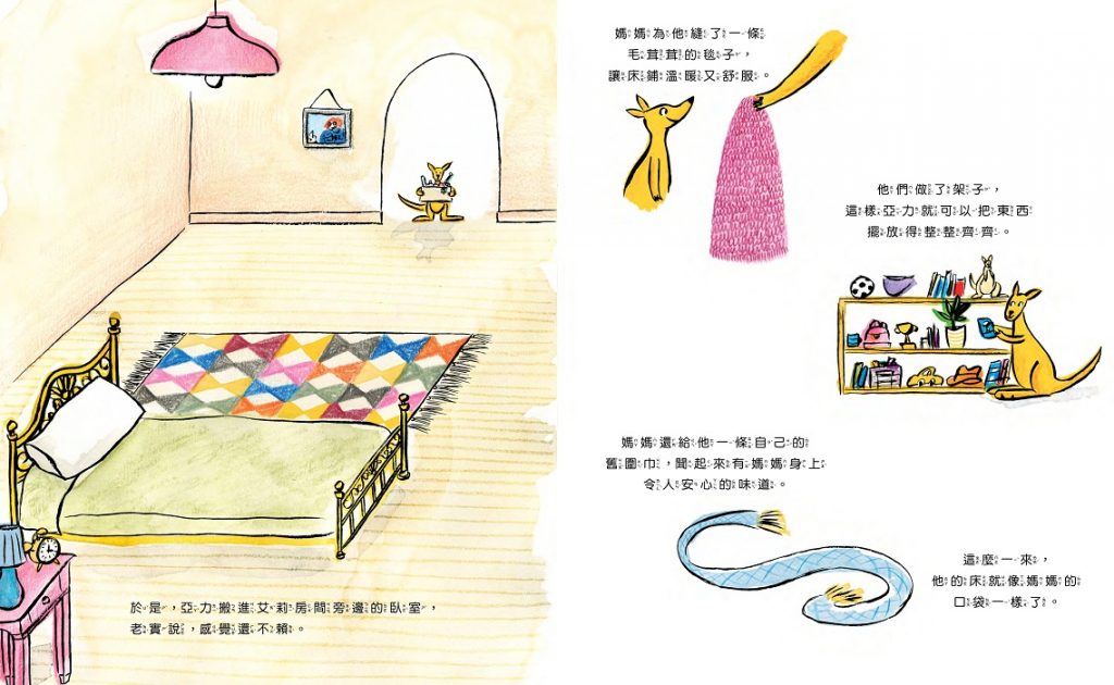 育兒專家指出,幼兒在練習和父母分房睡覺的過程中,最重要的是「氣味」的安全感和新環境的探索與適應。這也正是為什麼故事最後袋鼠媽媽要為小袋鼠織一條毯子,給他自己的圍巾,並且帶著他一起打理房間。這些都是幫助他邁向獨立的重要元素,為他漸漸培養責任感,也漸漸獲得自由。
