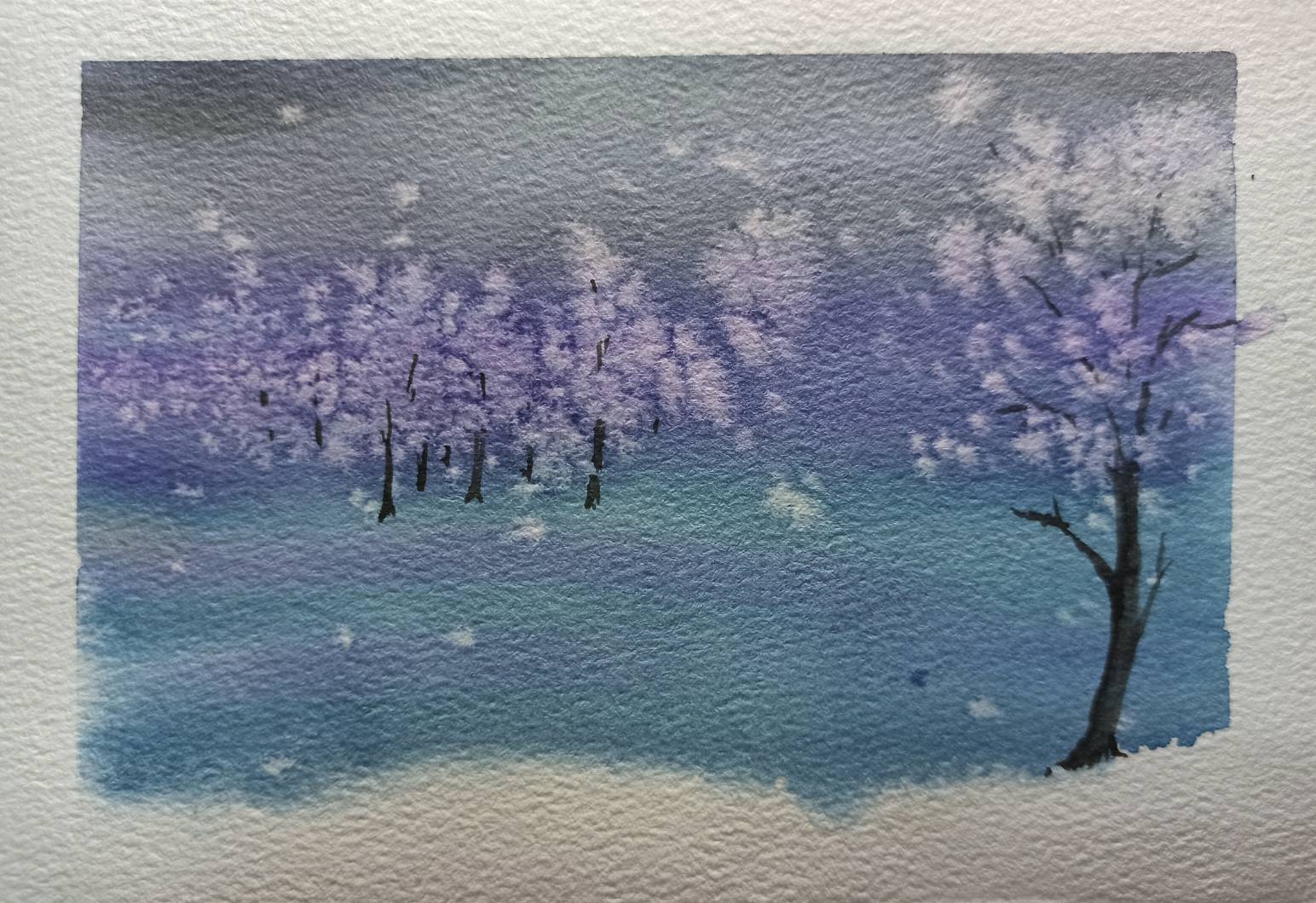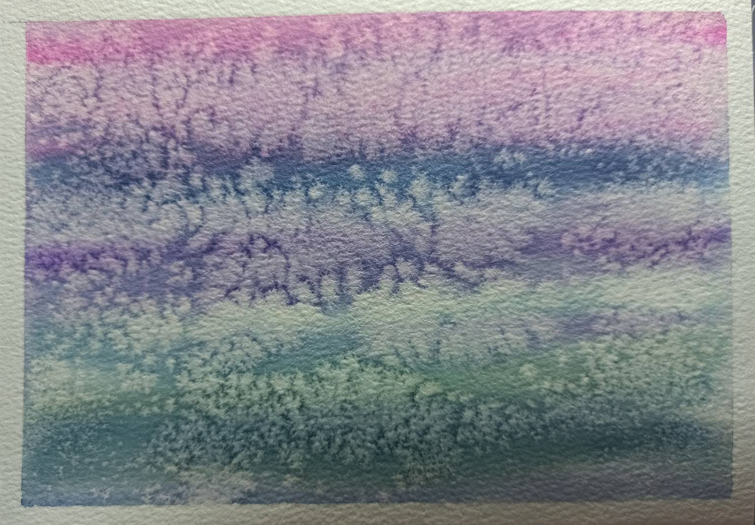 遊戲6 在水彩未乾的畫面上撒鹽,仔細觀察鹽粒的作用就是吸收水彩周圍的顏色,最後畫面就留下一點一點的小白花圖案,最後再抖掉畫紙上的鹽,這就是水彩中鹽粒的特殊效果。視背景顏色可以是櫻花林、可以是雪景、星光或海面上的波光粼粼。(圖10-11)