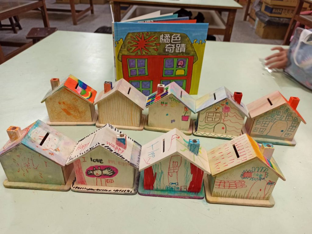 遊戲5 利用浮水染顏料,將小木屋存錢筒,染出自己想要的色彩,晾乾後,可以在房屋的周圍增加一些布置,成為一個小巧美麗的藝術品。課程結束後可以集合大家的小房子,排成一條如繪本《橘色奇蹟》中梅豆豆先生家的巷子或創造個小小社區。(圖9)
