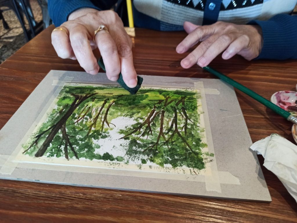 遊戲7 未用過菜瓜布,剪成小塊,再用菜瓜布沾顏料來蓋印章,其實,菜瓜布還可以運用在畫樹葉的技巧上(圖12);而蔬菜也可以拿來沾顏料蓋印章喔!