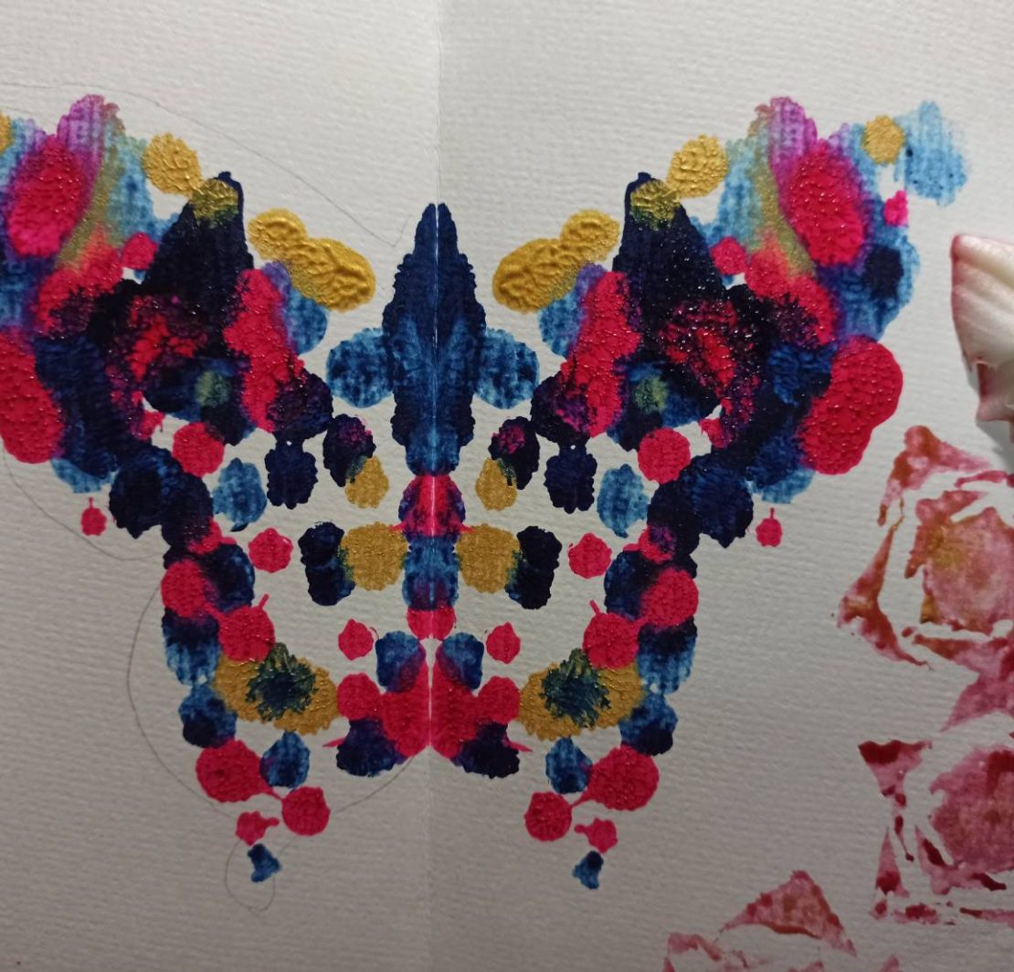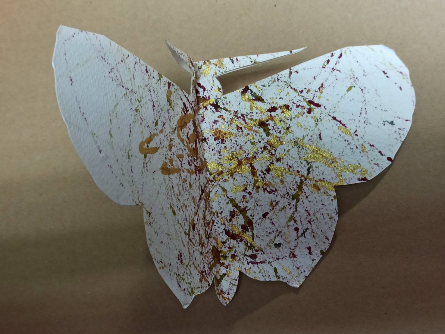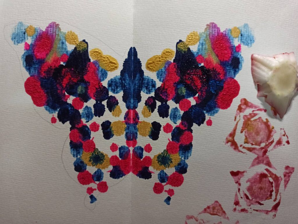 遊戲3 將水彩紙左右方向對摺,在左半邊畫下蝴蝶的半邊線稿再點上許多水彩顏料,對摺後擠壓,即完成一張美麗的作品。(圖8)