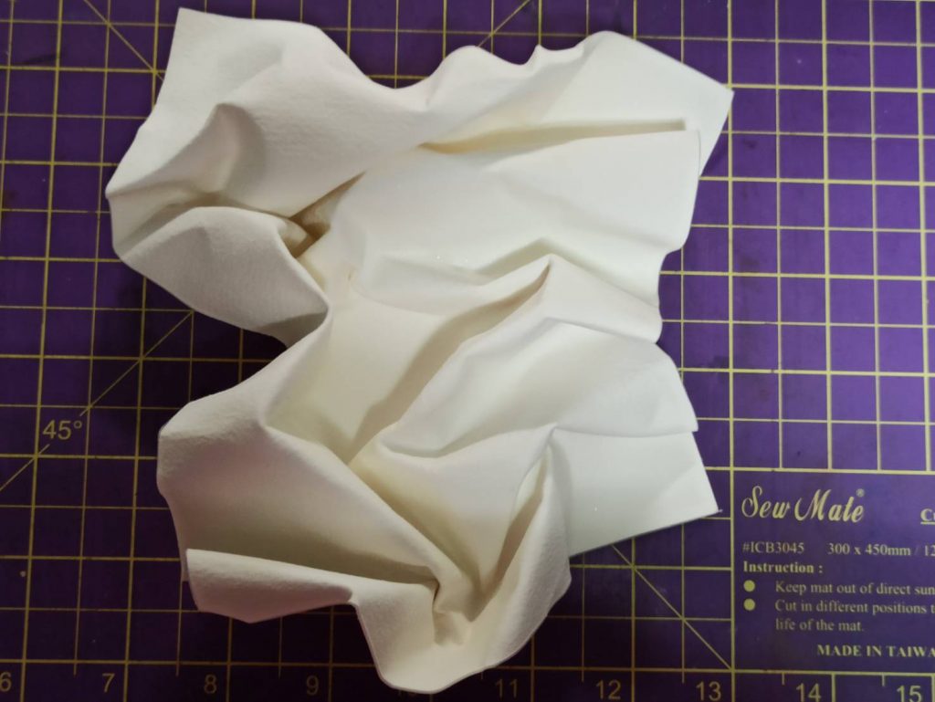 遊戲8 取一條綿線,長度約為紙張的二或三倍長,染上不同顏色後,放入對褶的紙張中,一手壓住紙張上方,一手抽出綿線,利用紙張的擠壓,創造出美麗的花朵,可以局部修飾或增添小細節,即完成。