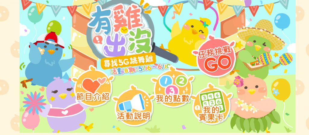 「有雞出沒」活動取5G諧音,每週共有5隻可愛的跳舞小雞,神出鬼沒不定時出現在公視兒少人氣節目裡。 鎖定公視13頻道17:00~18:30兒少時段,記住畫面中出現的跳舞雞圖案,到「有雞出沒」活動官網回答問題,就有機會獲得報到禮和賓果大獎,一起看好節目抽大獎喔 !