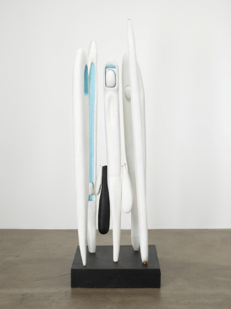 當你看到眼前這五根排排站的白色棒子時,是不是腦袋裡浮現很多問號,覺得當代藝術真難懂呢?別緊張,仔細觀察中間那根頭圓、腿細,最上端還有個小洞的棒子,然後發揮聯想力,就會發現這根棒子和家裡常用的某項工具造型很相似喔!這件名為《四十日之地,我》的作品,是藝術家路易絲・布爾喬亞以縫衣針和梭子為靈感所創作的木頭雕塑。由於路易絲從小就在編織和修復掛毯的家庭環境長大,因此很多作品都與縫紉和修補有關。另外,她也擅長將物品擬人化,像是我們剛剛觀察的中間那根縫衣針,代表的就是藝術家本人,周圍的白色梭子則代表小時候一起從事掛毯修復工作的女人們,隱含著過去曾經相伴的人如今又回到我身邊的意義,是不是很暖心呢?