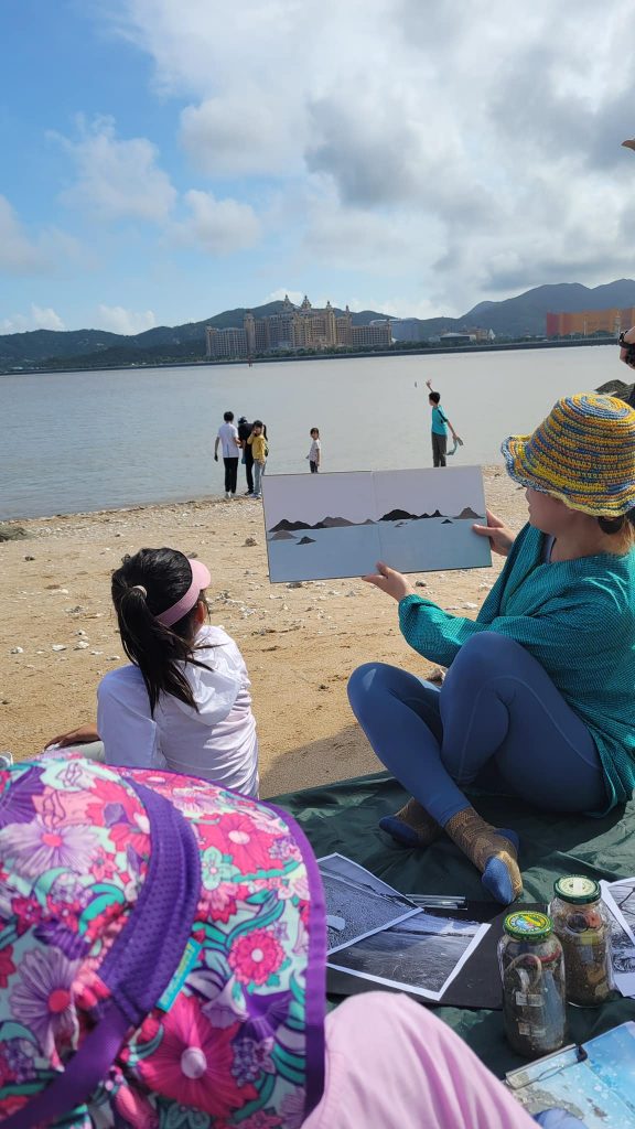 「在戶外讀環境繪本,可以回歸『觀察』。應澳門圖書館邀請,和孩子們一同在山林閱讀,我選了《上面有什麼?下面有什麼?》。孩子們因為在『無蓋的』的戶外,他們的答案比較多出於自己的觀察,如果是在室內,小孩會傾向去迎合標準答案,並非從自身的經驗出發。」
