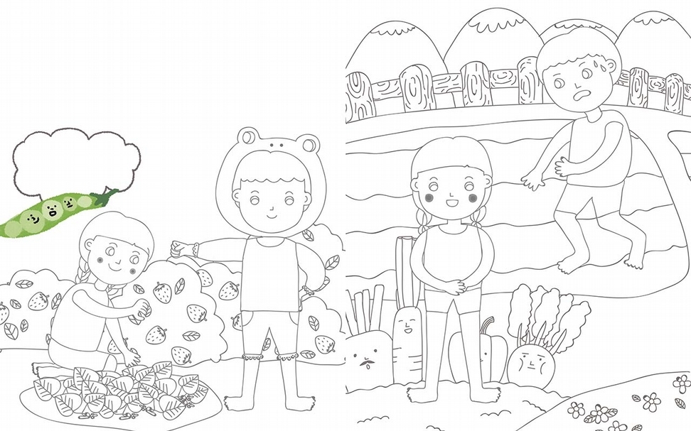 玩法 1請用色筆或水彩、蠟筆等工具,幫這些小農夫,畫上你設計的農夫裝。 2如果暫時沒有靈感,可以先翻到下一頁的參考造型,再回來畫,背景也可以塗色喔。