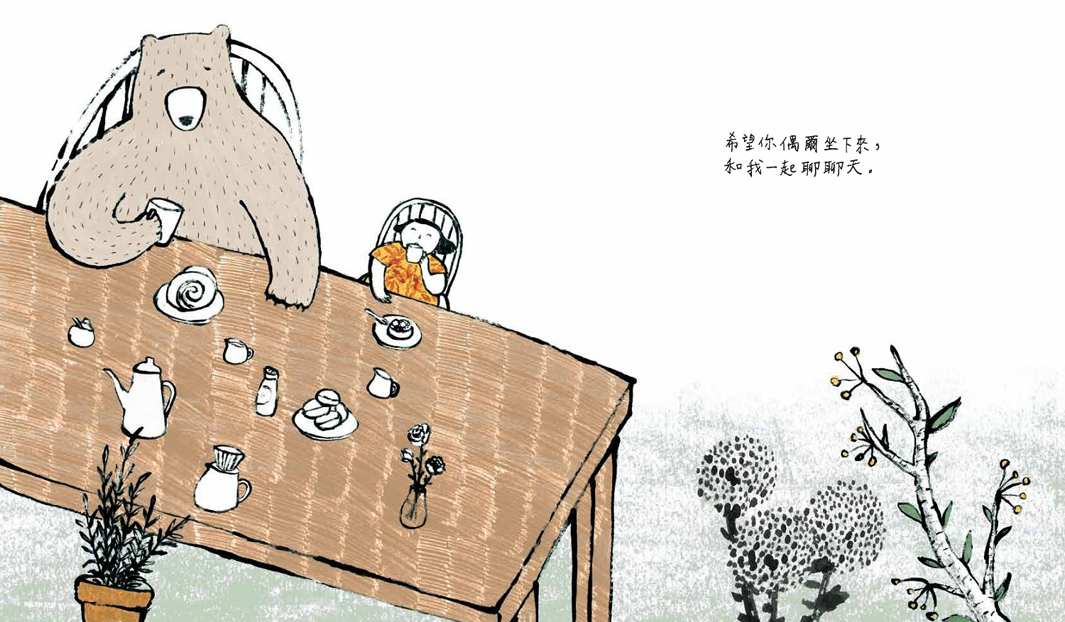 王淑慧是我很喜歡的插畫家之一,簡單的線條裡盡是多情的滋味。文字輕簡,圖像飽含和煦溫暖的質地,幾幅跨頁都讓我駐意良久,像是跟熊孩子一起灌注小花苗,右半頁是矗立的大樹,文字是這樣說的:「你來了之後。我們一起經歷了許多事,日子總是特別快。」圖像將時空的流動交織著情意綿綿,令人動容。一眨眼熊孩子變成大毛孩,時間是最殘酷的主題,一轉瞬就只能望著孩子離去的背影,母親的宿命是等待,是構築溫暖舒適的避風港,盼他歸來可以喝杯熱茶,聊聊心事,已然足夠。