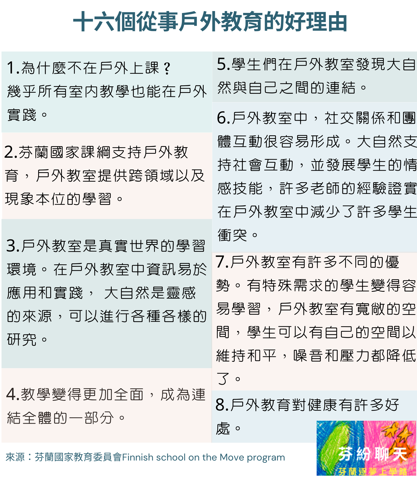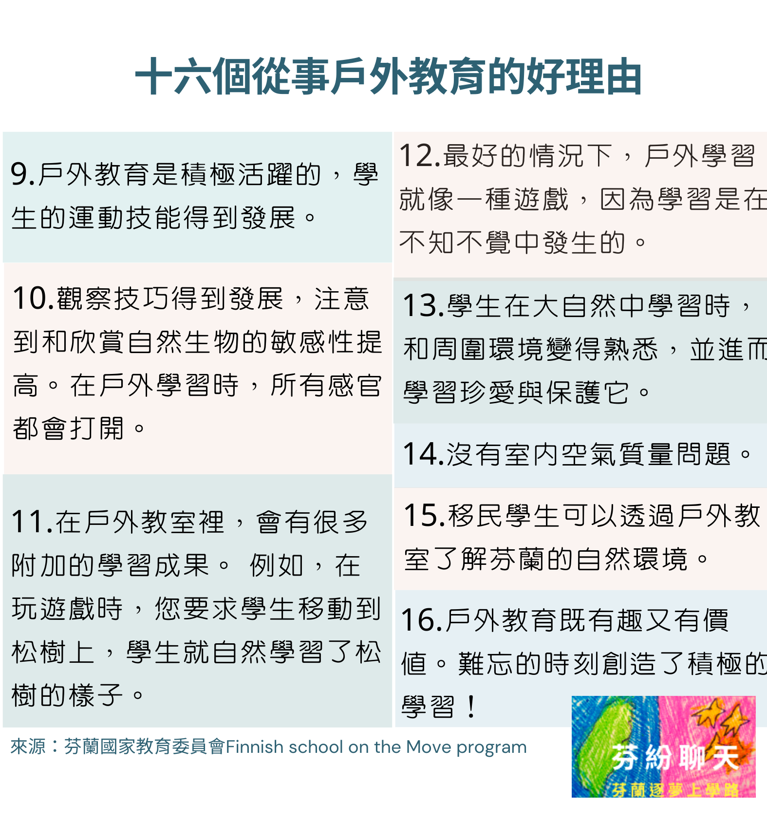 不只是幼兒園,芬蘭國家教育委員會亦在中小學推動戶外教育,並在「戶外教室:在大自然中活動與學習」的專案計畫中,列出了十六個在戶外教室上課的好理由,強調每一個學科都可以在戶外進行,戶外教室更是跨領域與現象本位課程最適合的實踐場所。