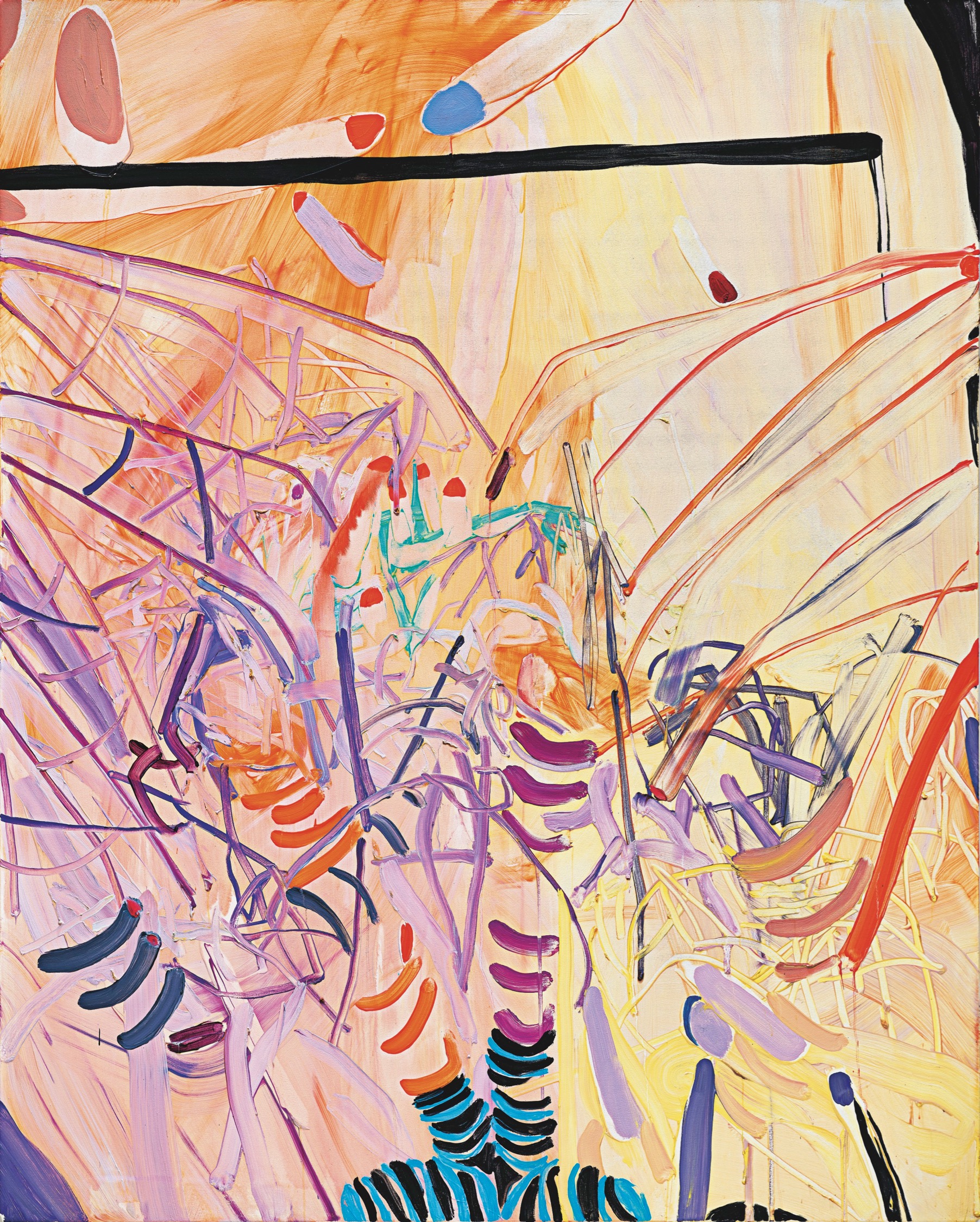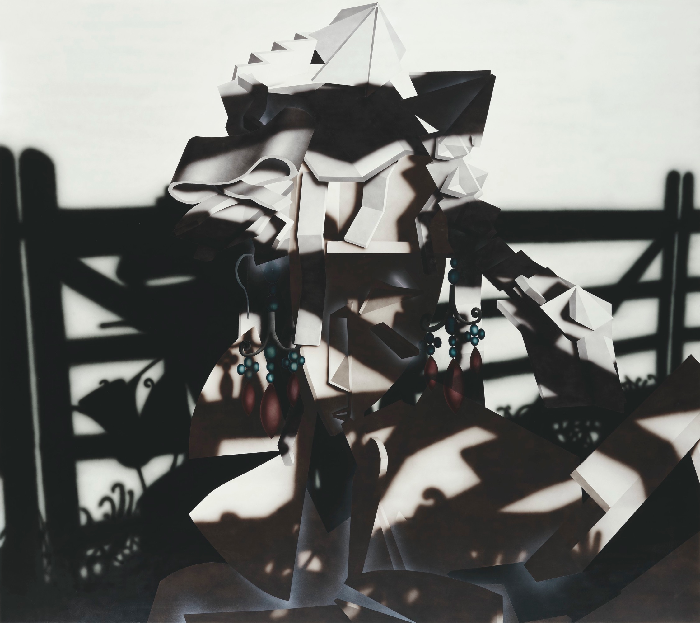 1987年出生於紐約的艾佛莉.辛雅(Avery Singer),由國際知名的藍籌畫廊豪瑟沃斯(Hauser & Wirth)代理,個人拍賣紀錄超過4百萬美元。辛雅的創作技法使用了Sketch Up 3D 建模程式,畫出底圖結構,投影至畫布之上,再使用噴繪顏料繪制出複雜的層次。這種獨特的藝術創作方式將立體場景移植於平面上,結合傳統繪畫技巧與數字技術,呈現出跳躍在虛實之間的迷人視效。《無題(星期二)》展現了辛雅最為標誌性的創作手法。畫面中,簡練的幾何圖形上覆蓋著陰影,延伸至畫布外圍,給半具象圖形再添神秘光暈。戲劇性的光影效果暗示我們,畫中世界遠不止於眼前呈現出的方圓之間。