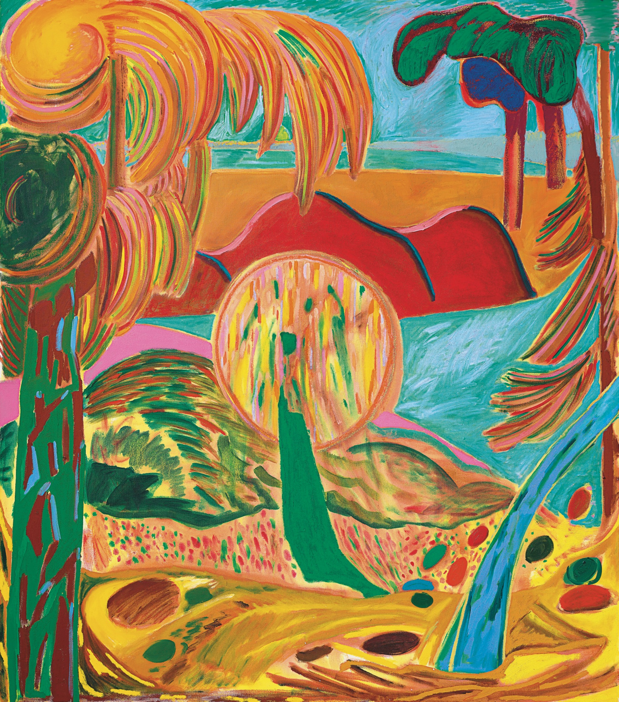 作為大衛.霍克尼(David Hockney)的追隨者,出生於1981年的美國藝術家莎拉.休斯(Shara Hughes)2015年移居紐約後,創作題材轉為風景:以烏托邦的構圖營造屬於自己的虛實世界;用同樣明晰的筆觸、霍克尼式飽和的大膽色彩調配表達她的所思所想、堅定她的信念。本次作品《這不是我的叢林,我僅僅棲息於此》為藝術家想像與記憶中的叢林,面對場景的未知性,將帶給藏家無處可尋之感。