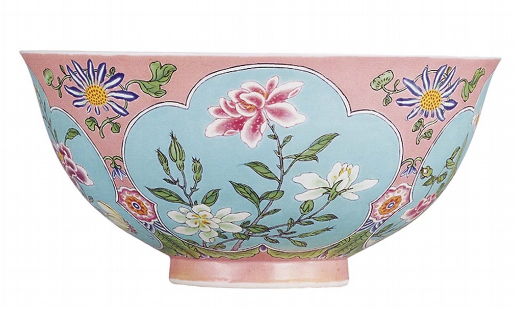 清康熙〈粉紅地琺瑯彩開光花卉碗〉。(本刊資料室)