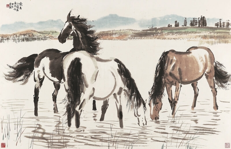 徐悲鴻1934年作〈飲馬圖〉,水墨紙本,72.8×112公分,預估價1800萬~2200萬港元。