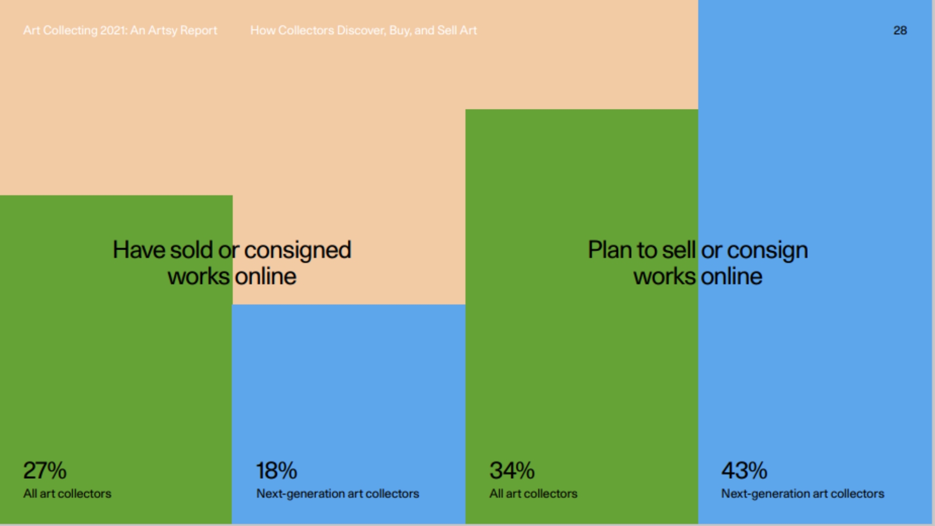 《2021年藝術收藏:Artsy報告》(Art Collecting 2021: An Artsy Report)於2021年7月正式發布。相較於2019年的《在線藝術收藏家報告》(The Online Art Collector Report)中線上銷售僅佔整個藝術市場的9%,2020年更佔藝術市場的四分之一。Artsy 對藝術藏家進行了調查,內容有關線上交易的喜好與建議等各個方面。此報告首先將「藏家」定義為那些表示曾多次購買過藝術品,且在2019年或2020年在藝術品上花費至少1萬美元的受訪者,而在2021年有類似消費規劃的調查參與者也位列其中。在2,290名受訪者中,有765人屬於此類別,而報告更聚焦過去四年踏入藝術收藏界的新人們,並將其統稱為「新世代藏家」(Next-Gen Collectors)。這個群體包括139名受訪者,約佔整個收藏家群體的五分之一。