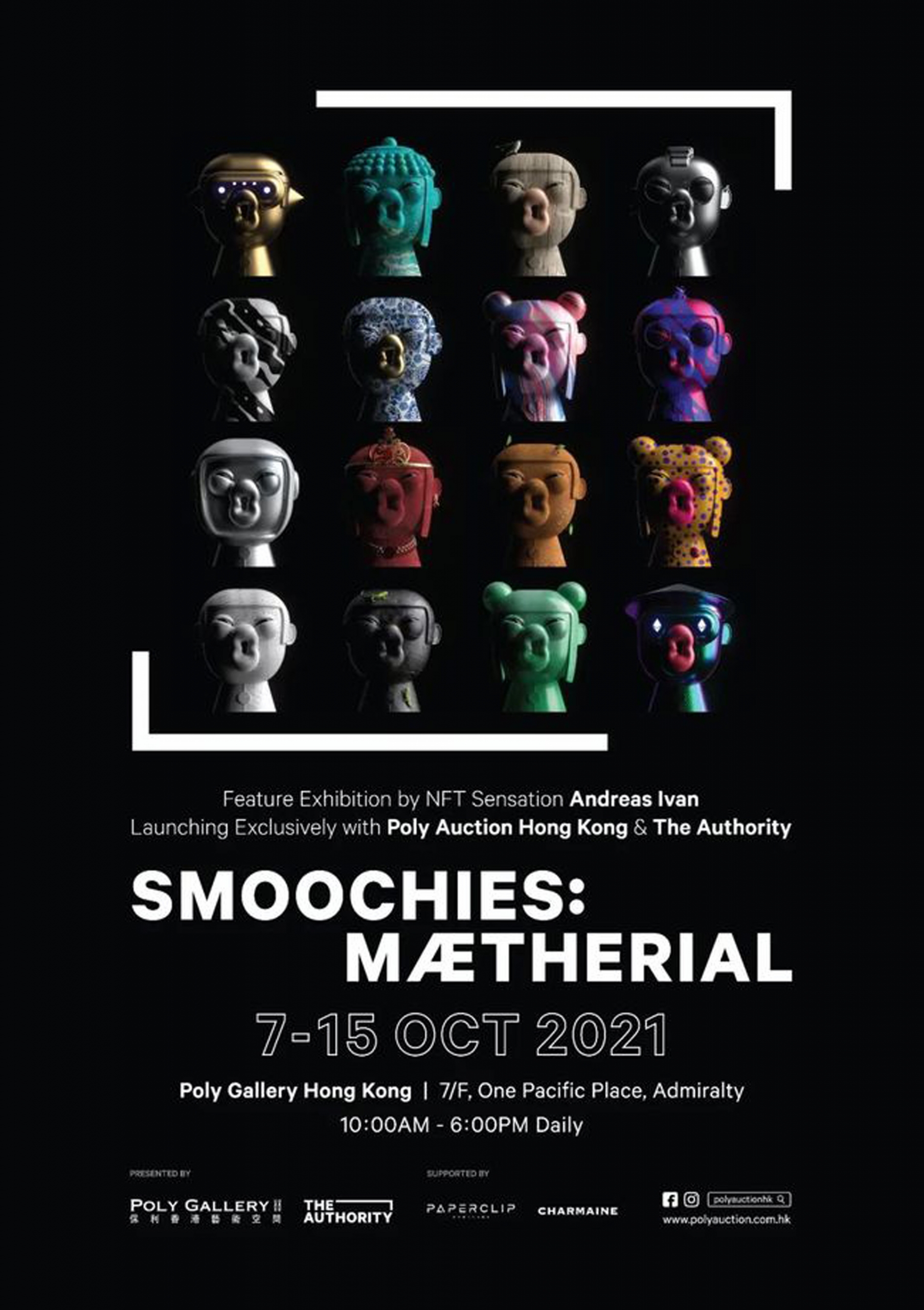 Andreas Ivan的「MÆTHERIAL系列」作品將於10月7日至15日於保利香港藝術空間展出。此次專場是Andreas首次與拍賣行合作,展出Andreas專為此次展覽所創作的16個MÆTHERIAL系列的「Smoochies」。Andreas更首次為每個「Smoochies」印製八幅實體版畫作品,一旦買家在網路競投成功Smoochies的NFT作品,將免費獲得該款的第一版實體印刷作品,目前其餘七版已在展覽期間便迅速售罄。Andreas表示他創作生涯中只會推出100個「Smoochies」NFT作品,加上此次展出的16個全新作品,現有「Smoochies」的總數已增加至52個,收藏機會刻不容緩。
