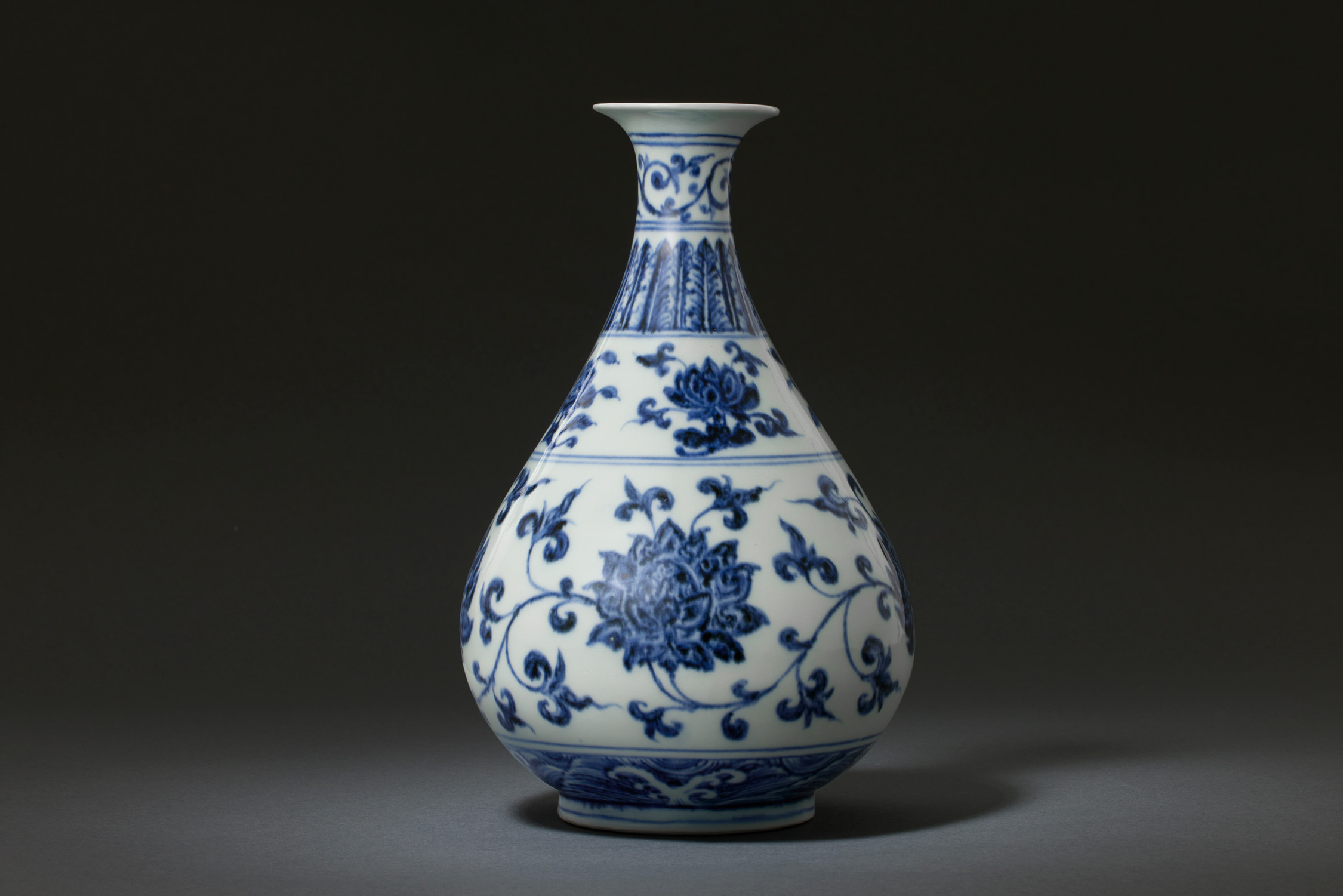 明永樂《青花纏枝蓮紋玉壺春瓶》通體繪五組青花紋飾,以雙線相隔。頸飾卷草紋和蕉葉紋;肩飾折枝牡丹,月季,山茶和蓮花;腹繪四朵纏枝蓮花,枝葉相纏;近足處繪浪濤紋。此器造型秀麗俊俏,發色鮮明,釉色瑩潤。永樂青花有「諸料悉精,青花最貴」之說法,在紋飾和造型上都出現了新的風格,逐漸擺脫了元朝的遺風。青料採用進口的「蘇麻離青」,發色青翠濃艷,背花紋飾泛出點點銀黑色結晶斑,與前朝所用之國產青料形成了強烈的對比,為明早期青花瓷器的經典佳作為仇焱之舊藏。傳世品中只有一件相同的例子現藏台北國立故宮博物院,此器故更具收藏價值。