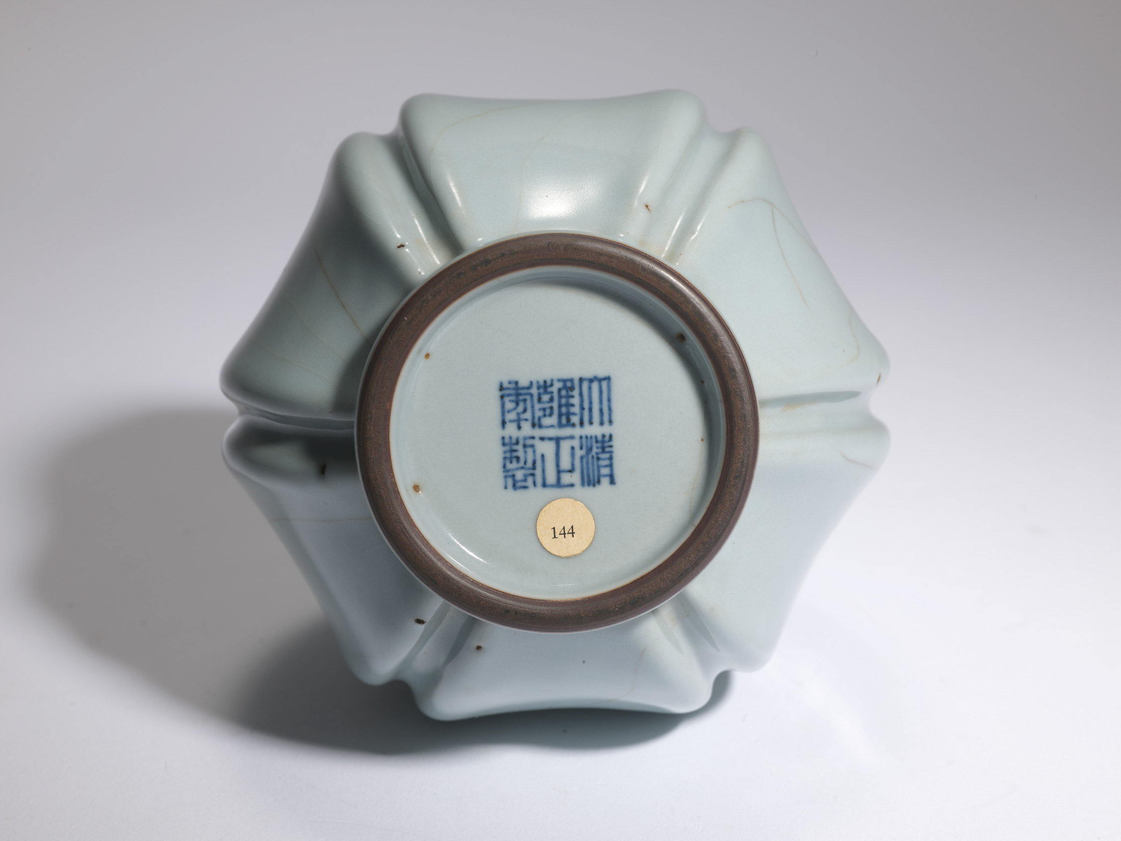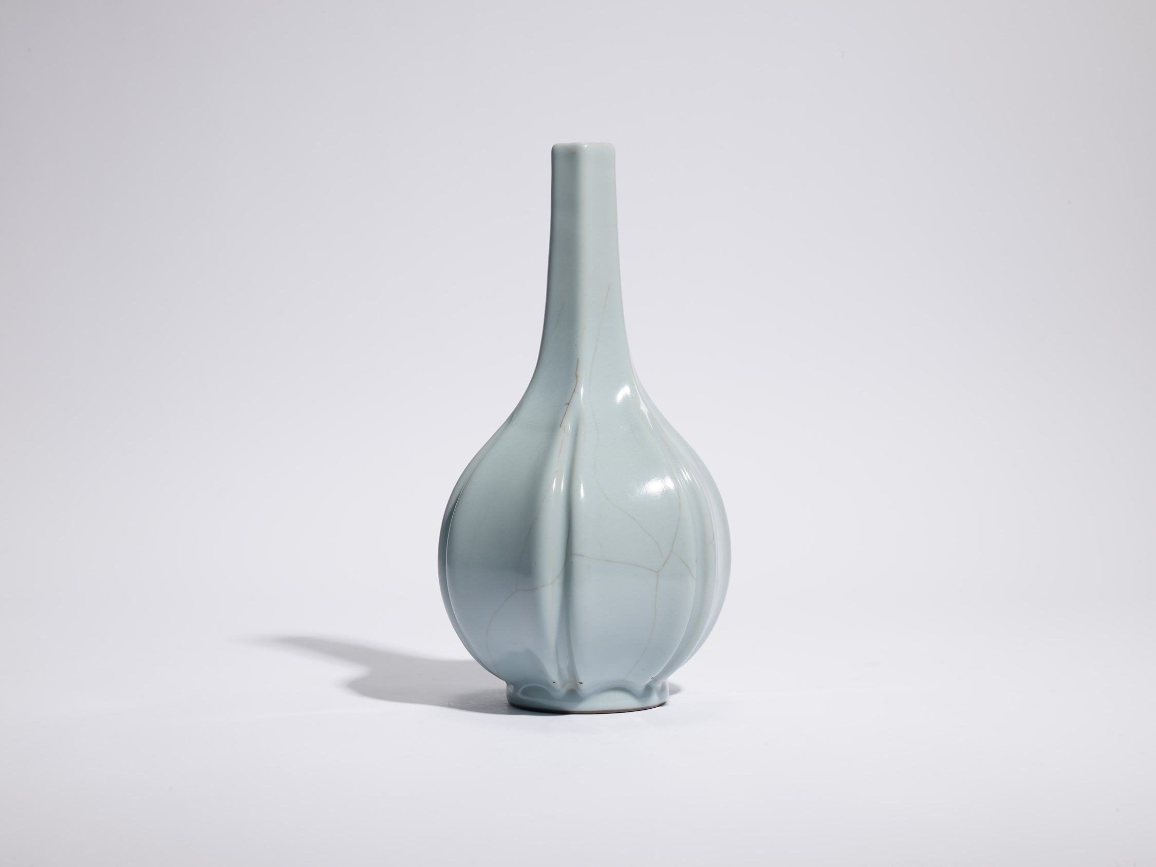 清雍正《仿官釉五瓣瓜棱瓶瓶開五棱》,長頸直口,通體施仿官窯天青釉,足圈棕褐,沉博絕麗,清雅出塵,為雍正時期仿宋官窯之珍品。雍正皇帝與皇父康熙和皇子乾隆一樣,俱鍾情於蒐求古玩,並曾多次下令製作仿古用器,其中仿古陶瓷種類尤其繁多。御窯督陶官中的翹楚—— 唐英於1735 年撰成《陶成記事碑記》,文中即列舉了約五十七類器物和近四十種釉料,包括一批從宋瓷汲取靈感的釉料,位列仿宋器首位的即是本瓶上所見的「仿鐵骨大觀釉」,其重要性可見一斑。器形相近的雍正五瓣瓜棱瓶雖經著錄,但皆施仿哥釉,仿官釉者除此瓶之外似不見他例,此瓶可能為孤品,為20世紀初期之法國私人珍藏。