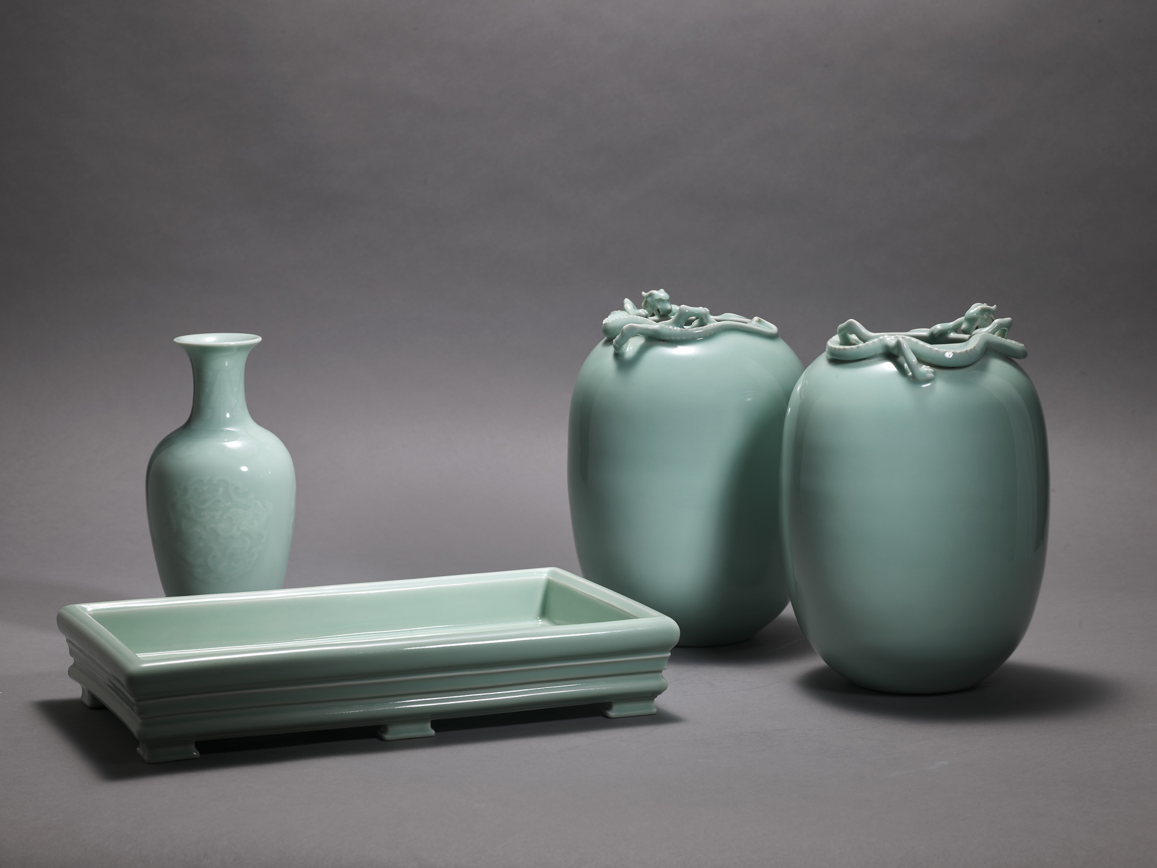 清乾隆《粉青釉凸花團螭紋觀音尊》本瓶器形簡練,體態雅致。紋飾以減地錐拱技法而成,團螭紋分佈於腹部兩側,頸部飾蕉葉紋,間以花卉及圓點,肩頂再飾一圈花卉、圓點,於一圈如意雲肩之上,脛部為花卉紋及蕉葉紋。整體紋飾於瑩潤的粉青釉下若隱若現,清雅致極。粉青釉瓷器於乾隆時期頗為盛行,但釉色純淨及紋飾細緻如此瓶者極為罕見,爬梳全球公私珍藏,似未見其他相同之例,為暫得樓舊藏,曾出版於1950年Helen D. Ling 及仇焱之《暫得樓珍藏歷代名瓷影譜》以及曾展出於上海博物館、首都博物館、香港中文大學文物舘「暫得樓清代官窯單色釉瓷器」展覽。