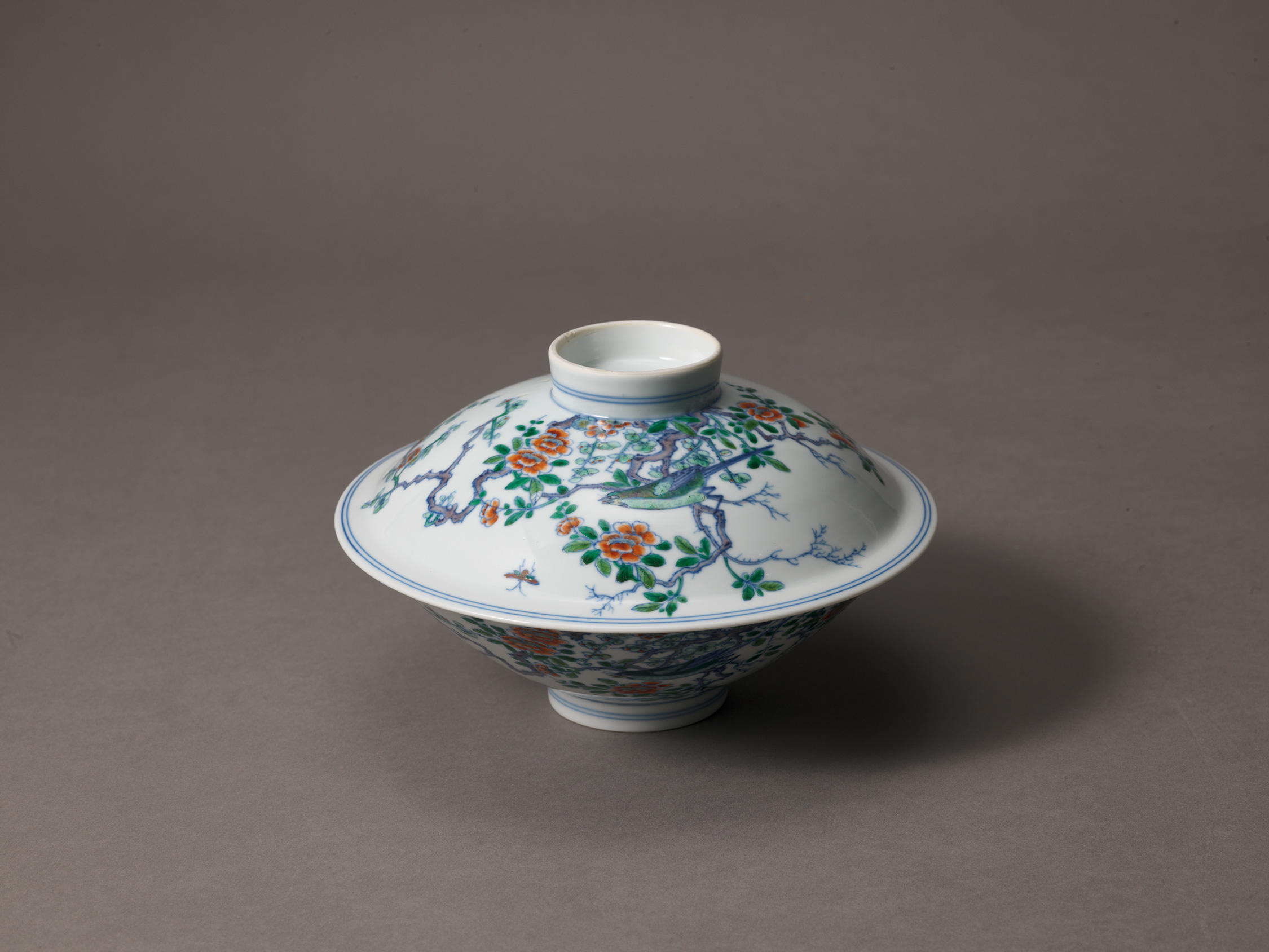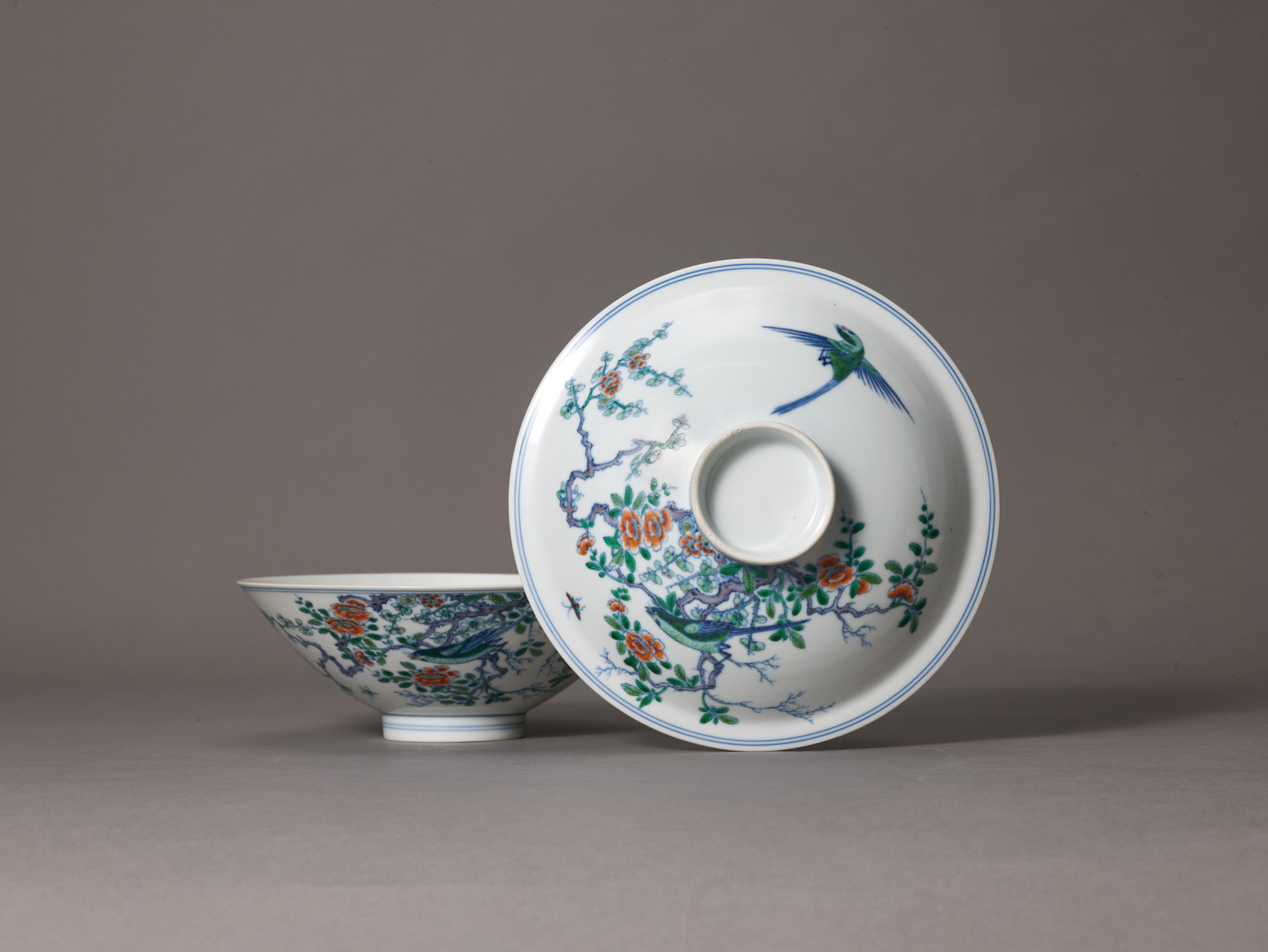 清雍正《鬥彩喜上眉梢紋蓋盌》通體繪鬥彩花鳥紋蓋面及器壁均繪一喜鵲棲息於梅花和芙蓉花枝上,另一喜鵲展翅空中。 圈足內青花雙圈內書《大清雍正年製》三行六字楷書款。 此盌造型規整,胎薄體輕,器蓋與盌能嚴密扣合。 紋飾以青花勾出線條,再填彩,技法嫻熟,紋飾生動逼真,色彩瑰麗,為雍正鬥彩器中之上上佳作,同時也是徐展堂舊藏。近似例見於全球知名珍藏,包括北京故宮博物院一例;瑞典遠東文物博物館一例;大英博物館一例;上海博物館三例。除本拍品以外,流通領域近年似僅見另一例,其為琵金頓舊藏,2016年4月6日於香港蘇富比拍賣。