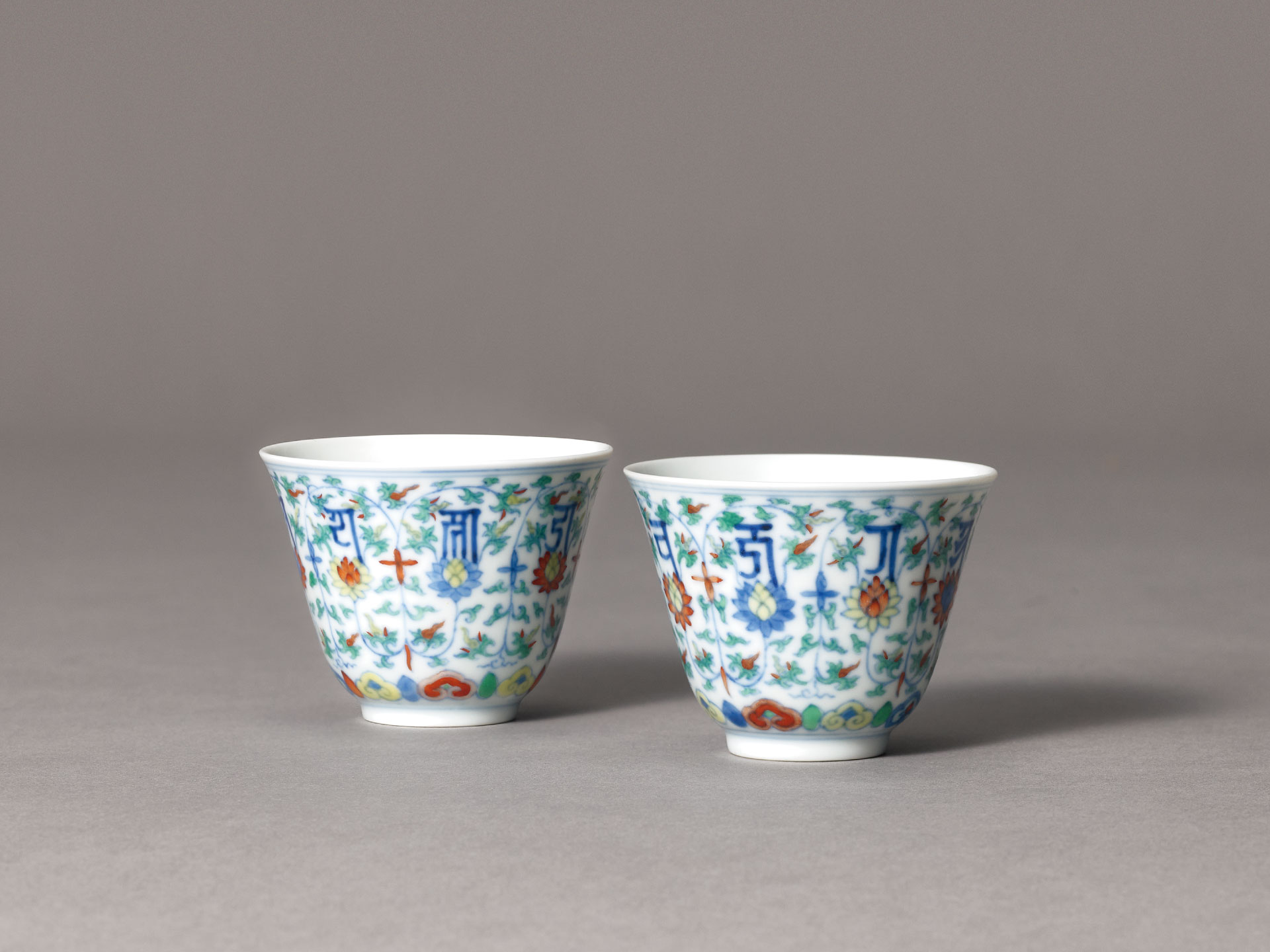 清雍正《鬥彩纏枝蓮托蘭札體梵文小盃》此對珍稀的小盃為雍正時期內廷佛堂用品,其外壁以青花鬥彩描繪繁密的番蓮卷草紋,每朵番蓮上托一蘭札體梵文,用筆纖細,色澤雅緻,底書「大清雍正年製」六字雙行雙方框款,為雍正朝官窯瓷器之佳作。此類小盃依據明成化原型所作,無論器形、紋飾皆近乎相同。近似的雍正鬥彩梵文小盃多為博物館珍藏,如台北故宮博物院藏原存景仁宮一對。