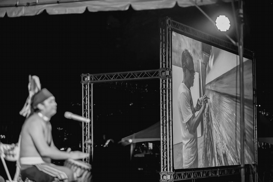 回到會場,「就讓我們停留在俊賢老師揮棒的這個姿勢。」李玉玲在台上這麼說著。受人敬重同時也擁有好人緣的李俊賢,讓許多藝術圈的朋友在當晚都帶著思念與祝福出現在會場。來自東海岸的原民藝術家伊祐・噶照、撒布・噶照跟古勒勒,身著傳統服飾,以原住民的祭儀及歌聲向記憶中的李俊賢敬酒;原民音樂家達卡鬧也帶來了〈貨櫃創作曲〉向李俊賢致意;而主辦單位高美館更是從臉書上搜集了眾人對李俊賢的感懷片語,向在座的好友至親們送上了慰問;最後,紀錄片持續播放著李俊賢與南島文化藝術家們的交流,與魚刺客們聊藝術聚會的畫面,以及定格在他專注作畫的神情。對李俊賢的創作還有生活而言,「台」就是出自他的身體,就像面對濕熱的熱帶天氣,他選擇以吃檳榔來對抗而不吹冷氣,就像是談藝術不一定要在美術館而是可以在生活中的台式海產店。從李俊賢身上,我們看到的「台」是腳踏實地,站在台灣土地、體受台灣的一切,然後勇敢面向未來。