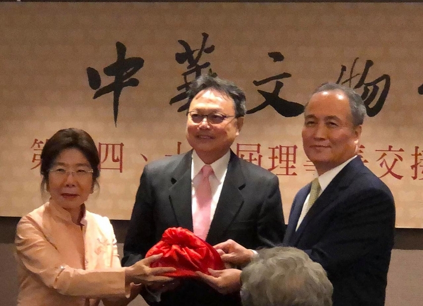 中華文物學會於上月31日舉行第15屆理事長交接典禮,前任理事長王水衷(右)遞交印信予接任理事長職位的曦之堂總經理陳筱君(左),清翫雅集前理事長洪三雄(中)則擔任監交人。(簡秀枝提供)