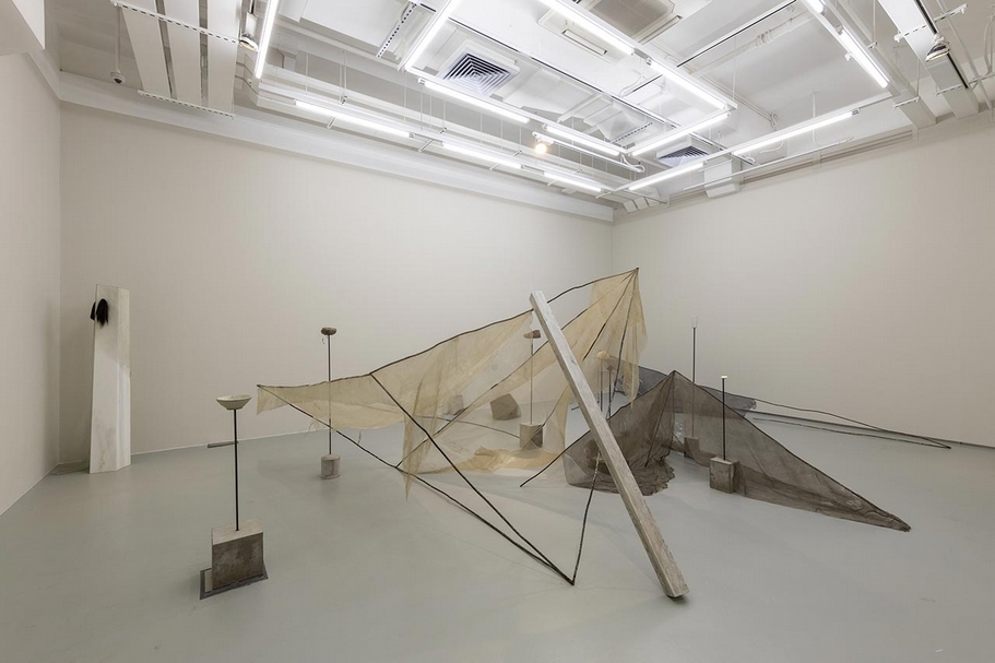 胡曉媛《石疑》,鋼筋、大理石、木、綃、木棍、海水侵蝕的石灰石、玻璃杯、肥皂、鑄鐵秤砣、磚塊、水泥、鳥巢、熱情果,尺寸不一,2019年,香港M+委約創作。(攝影/Winnie Yeung,香港M+提供)