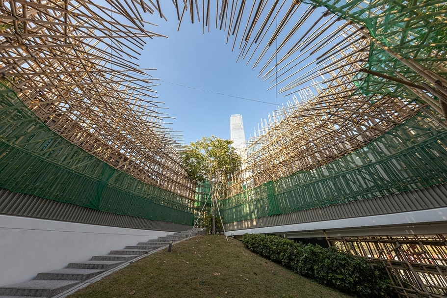 梁碩《山頂裏》 ,竹、塑膠網、人造樹枝 尺寸不一2019年,香港M+委約創作。(攝影/Winnie Yeung,香港M+提供)