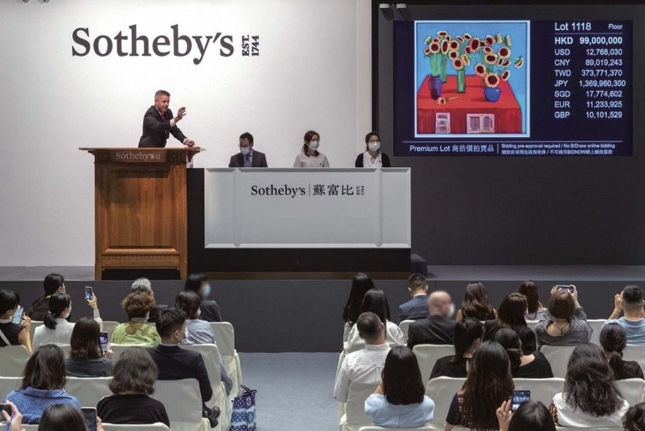 蘇富比和佳士得於2000年、2001年相繼離開台灣,駐紮香港後,得力於香港特殊的政經地位、成熟的國際金融體系與自由經濟的市場環境,沒幾年就讓香港成為和紐約、倫敦並列的全球三大藝術品拍賣中心。並進一步磁吸國際一線畫廊與巴塞爾藝博會(Art Basel)陸續進駐,鞏固香港作為亞洲藝術品交易中心的堅實地位。圖為2020年香港蘇富比春拍現場。(© Sotheby’s)