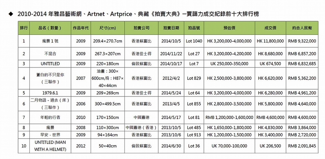 2010-2014年雅昌藝術網、Artnet、Artprice、典藏《拍賣大典》─賈藹力成交紀錄前十大排行榜 (製表/范欣茂)