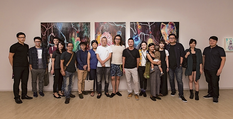 王亮尹與其它藝術家友人共同合影,包括悍圖社的郭維國、藝術家王亮尹、關渡美術館館長曲德益、藝術家邱建仁等共同合影。(大未來林舍畫廊提供)