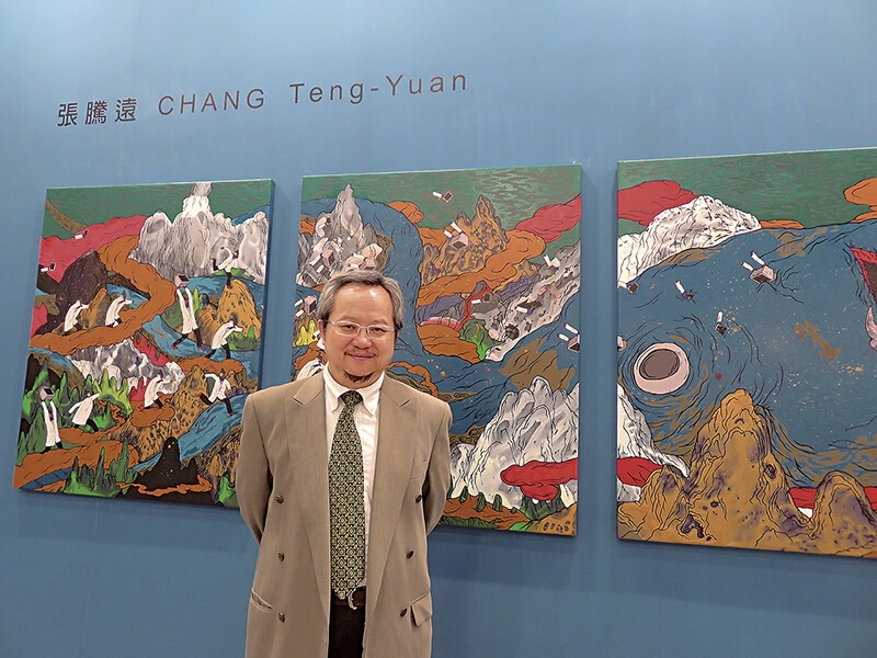 第一屆福爾摩莎飯店藝博現場,大會總監張學孔(最左)聯電集團榮譽董事長曹興誠(中)藝術家谷敏昭(右)。(Formosa Art Show提供)
