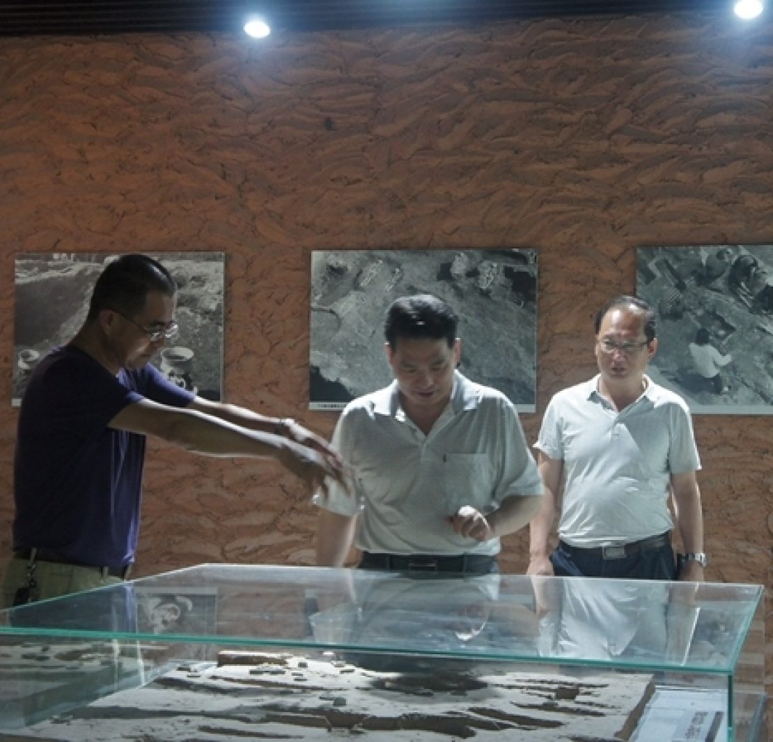 左起:大河村1972年第一次考古發掘領隊于曉興之子于宏偉,鄭州市文物考古研究所郝紅星,前大河村遺址博物館館長、現任鄭州嵩山文明研究院長張建華及考古挖掘人員,熱烈討論大河村遺址墓葬群。