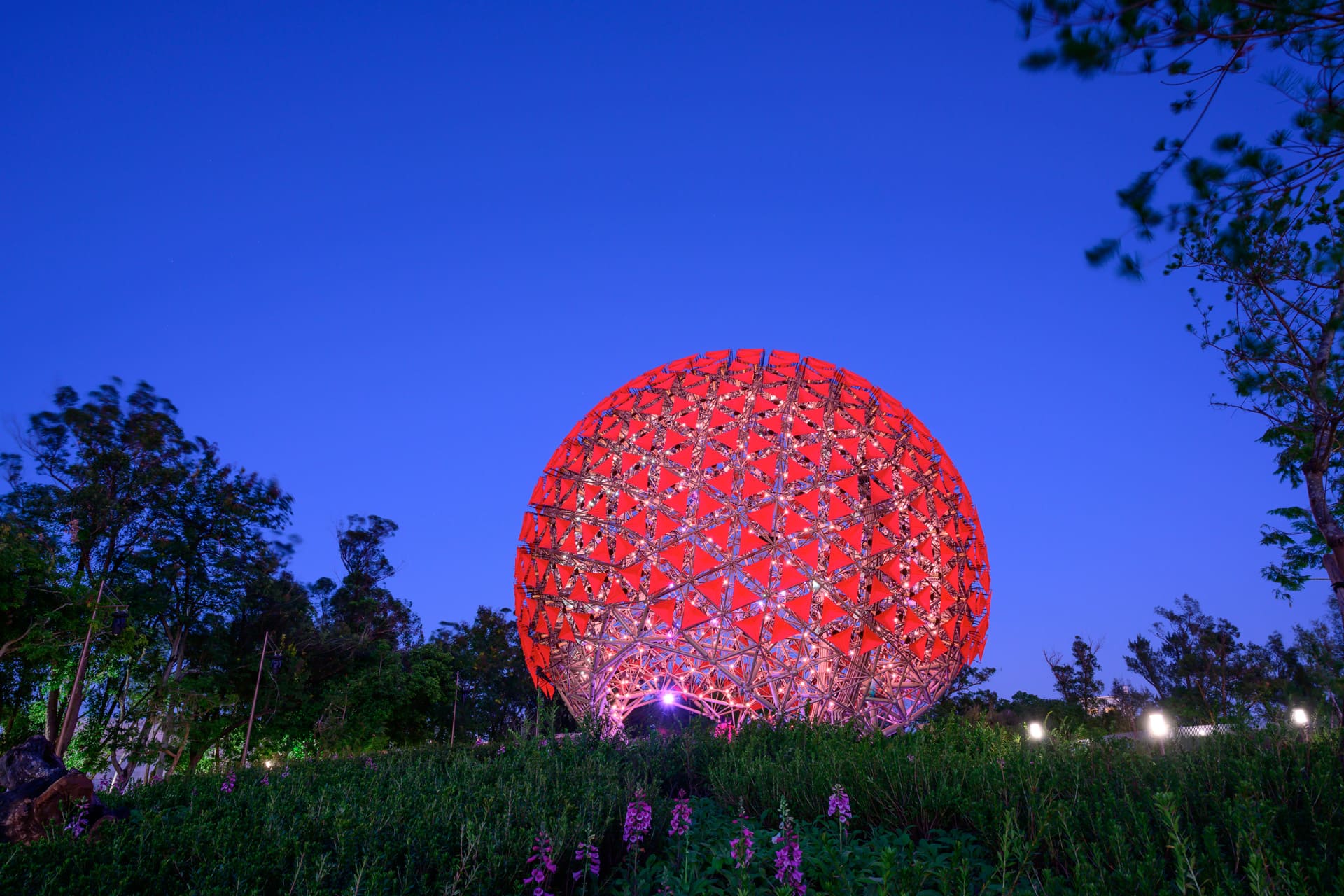 《乘風逐光》以豪華朗機工熱愛的太陽形象來打造全新的造型語彙,高約17公尺的巨型燈籠,在古稱竹塹狀似鯉魚有鯉魚穴脈傳說、先民依穴安廟的新竹,特別邀請在地宮廟,以各種祈福儀式加持54顆小燈籠懸掛於主燈。透過模擬風動,轉化物理現象和民俗意涵形成雕塑動態,這顆地面上最大的太陽所散發的熾熱,是指引希望的「祈福光流」。媒材上研究台灣使用竹的歷史,竹是台灣最常應用的生活材料之一,因應新竹九降風的威力,主燈製作特別選擇結構強度最佳的孟宗竹為材,參考各式竹篾交織法,在聲光機的動力控制下能做出各種造型。而主燈設計之初,依據最佳動態平衡計算出主燈上、下兩層各需54根孟宗竹,共計108根竹子。108在宗教上是很有意義的數字,有無窮盡的意思,如108個智慧、108個災厄等。108根竹子與動態平衡的巧合,或許在提醒人類追求身心靈環保必須奠立於萬物的相生相息。除了竹以外,新竹產製的玻璃工藝品和聖誕燈泡是台灣外銷的二大主流,主燈以使用過的回收家用玻璃經重鑄設計出216片有泡泡的玻璃片為核心,營造出如鏡子對映環境的漫射效果。
