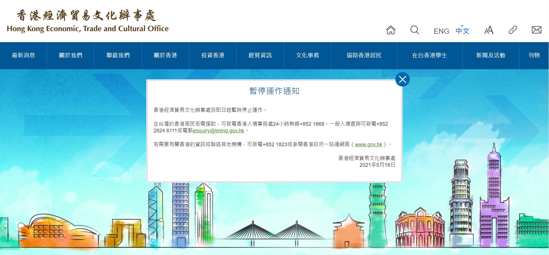 5月18日香港「政制及內地事務局」宣布駐臺灣經濟貿易文化辦事處即日起暫停運作,其官方網頁也已經貼出暫停運作通知,港府發言人回應記者詢問時表示,此安排與臺灣疫情情況無關,然並無說明關閉原因。