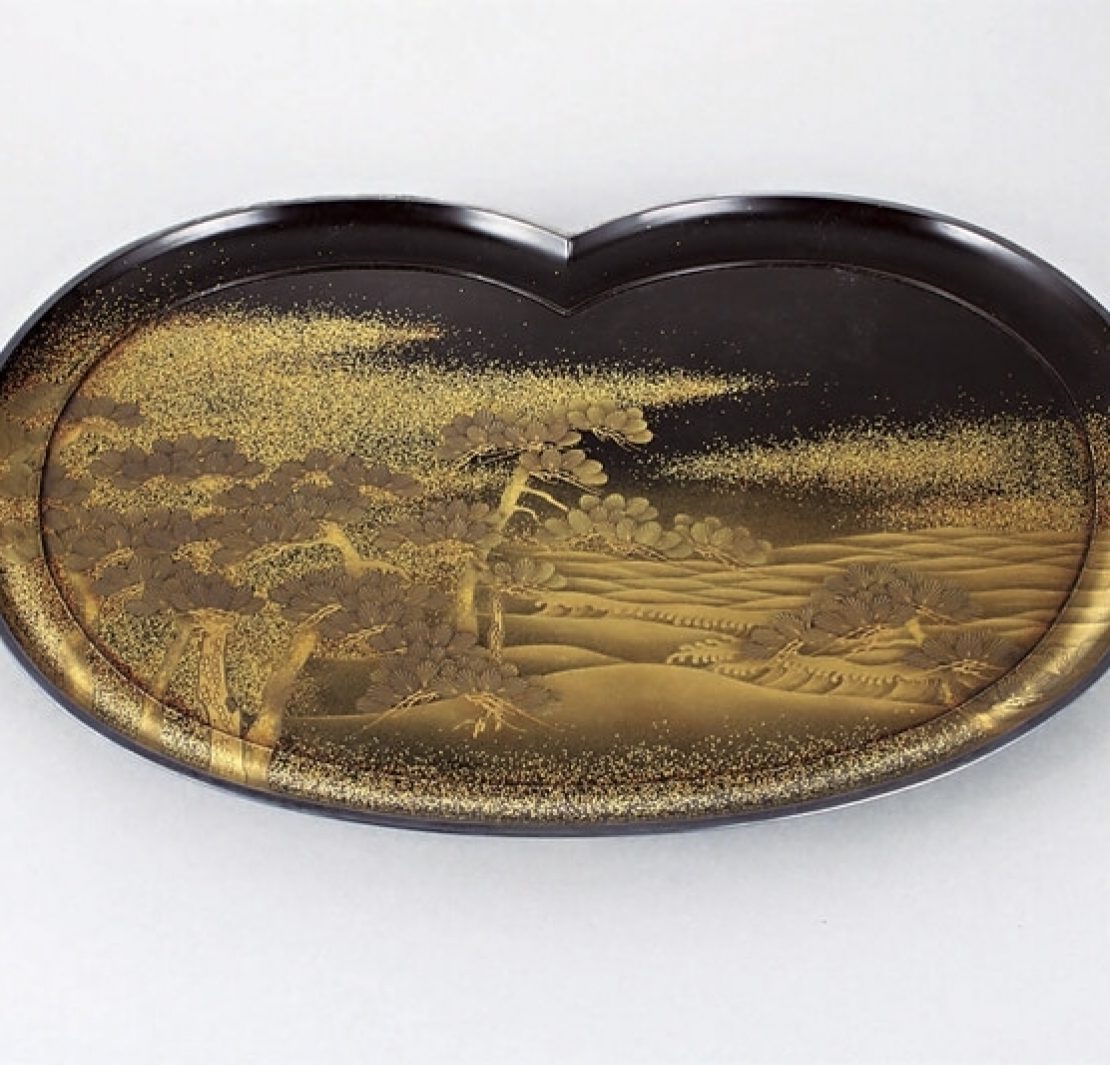 象彥八代西村彥兵衛〈松研出香盆〉,看似兩圓相合而成,底部附矮足,稱之為團扇型香盆,為盛放香爐用的香道具。整體漆藝技法主要使用「研出蒔繪」,先以漆描繪圖案,撒上金銀等金屬粉及色粉,等乾燥以後再在表面塗漆,完全乾燥後用木炭打磨。此一技法始於奈良時期,後來深受平安時期貴族階級喜愛,為金銀研出蒔繪的鼎盛時代。作品遠方以梨地表現出天空雲霞,搭配出海浪拍打沙岸旁松樹的景色,細緻的松葉蒔繪細紋,與源源不絕的波浪遠近圖紋,皆有長壽吉祥的祝福意義,為象彥八代西村彥兵衛時期的作品。