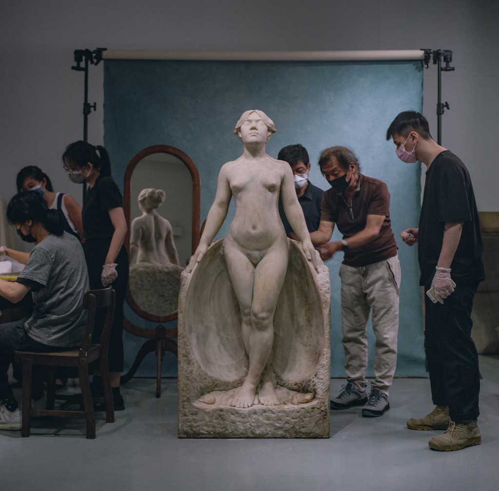1921年,黃土水以大理石雕刻的《甘露水》,暨《蕃童》後二度入選帝展。這件日後被譽為「臺灣的維納斯」的瑰寶,是臺灣首座裸體雕像,刻劃一名面容充滿自信的女子,頭微微仰起,姿態挺直,雙手輕輕放在身後的蚌殼上,綻放了光一般的向上精神,寄寓藝術家對於彼時正大步向前的臺灣社會的期盼與想像,也開創臺灣藝術史上的新篇章。隔年,此作受邀於東京和平紀念博覽會臺灣館展出,除了日本皇室對其作品產生高度興趣,黃土水的活躍更驅動著當時對藝術還很陌生的臺灣,使有志於藝術的臺灣青年們受到很大的鼓舞。