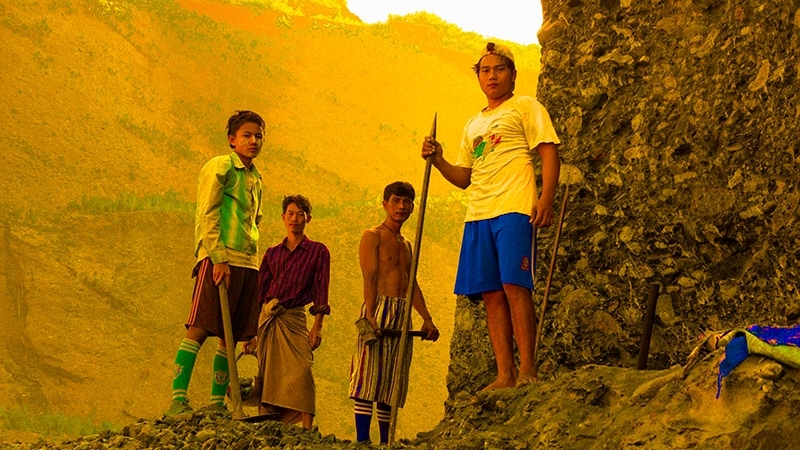 如果你去緬甸的瓦城、仰光,或是每個省會都會區就會看到上流社會、緬族,他們的服飾鮮豔得不得了,皇家用的東西都是金色、黃色、綠色,全是新衣服。我對大緬甸的印象就是這種金黃、鮮豔的,但是在作品裡談的是想變有錢的窮人,所以這是意識上的選擇,包括《翡翠之城》的音樂也是,裡面所有樂器都是宮廷樂器,是林強跟我去緬甸收錄,再用電腦處理的。關於顏色的第二個理由是技術,因為拍翡翠城時,用的機器包括iphone、GoPro什麼都有,剪接時要統一色調很難,所以最後全部讓它變成像底片般的雜訊、粗糙感。