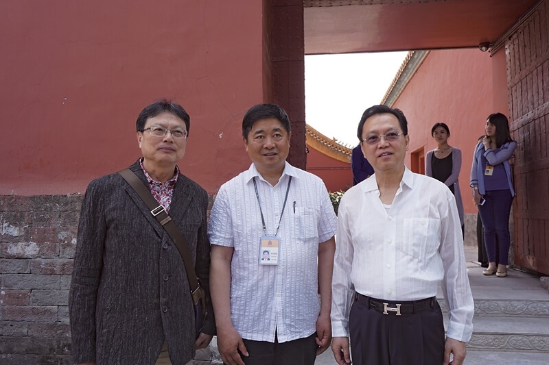 北京故宮館長單霽翔(中)與第九屆清翫雅集理事長洪三雄(左)、與現任理事長陳國和(右)進行交流。