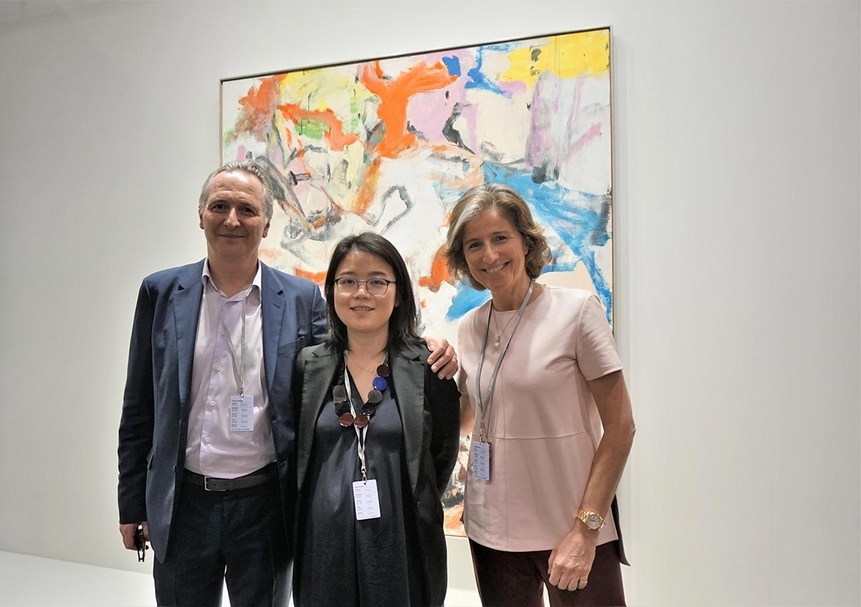 2018年Lévy Gorvy畫廊於香港巴塞爾藝術展會,呈現德庫寧1975年的作品(Willem de Kooning)《無題XII》(Untitled XII),並在香港巴塞爾藝術展會中以3,500萬美元售出!畫廊共同創辦人Dominique Lévy(右)、Brett Gorvy(左),與亞洲區資深總監李丹青,於畫作前合影,共慶歷史性的一刻。此作,亦是香港巴塞爾藝術展舉行六屆以來,成交價最高之作。(攝影/林亞偉)