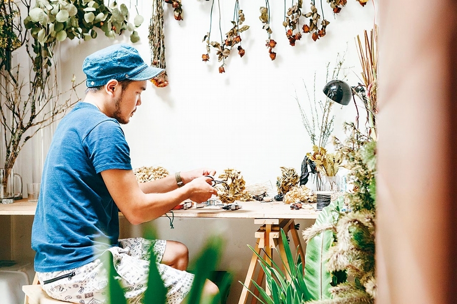 數年前在臉書上瀏覽過李霽的花藝作品,即便當時市面上已出現數間品質不錯的花藝規畫店鋪,仍藝術雜誌編輯式的體悟到,他處理花藝的手法是更接近一種「類創作」的材質堆疊。其對於造型與細緻層次排列的敏銳,詢問下了解他曾有專業的建築科系背景,另一部分則是老家來自花蓮,與自然長久以來的親暱感,使其在製作建築設計時即會著重思考空間與自然環境間的互為。雖然目前主持以植物創造提案為主的「質物霽畫」看似已脫離建築設計的範疇,但李霽坦言他的理想仍存在於「建築」之中,接案的內容仍包括許多室內設計提案,「植物」成為其實踐建築理想上一段重要的過程,也開啟和許多連結不一樣事物的可能性。他從求學階段很確定要做建築,到逐漸不同歷程的累積,包括學生及就業時期也開放自己參與劇團合作,做一些舞台設計案,而文青必備的電影、音樂、書籍等養分的吸收,他也沒省略過,兩年前他仍在建築事務所工作,但因為觸碰了以植物為創作這件事,開啟各種嘗試挑戰,也讓他選擇離開辦公室的生活,嘗試各種新鮮的合作可能,這同樣也累積出其作品豐富的樣態。