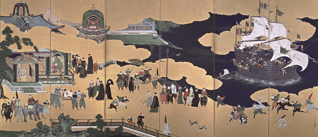桃山時代16世紀末至17世紀初期狩野內膳〈南蠻屏風〉左扇,六曲一雙,紙本金地設色,154.5×363.2公分。(國立故宮博物院提供)