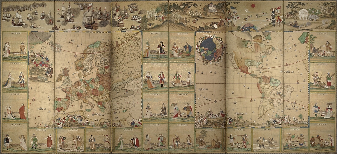 江戶時代18世紀前期(傳)小原慶山〈世界四大洲、四十八國人物圖屏風〉歐美地區,六曲一雙,紙本設色,163.8×362.8公分。(國立故宮博物院提供)
